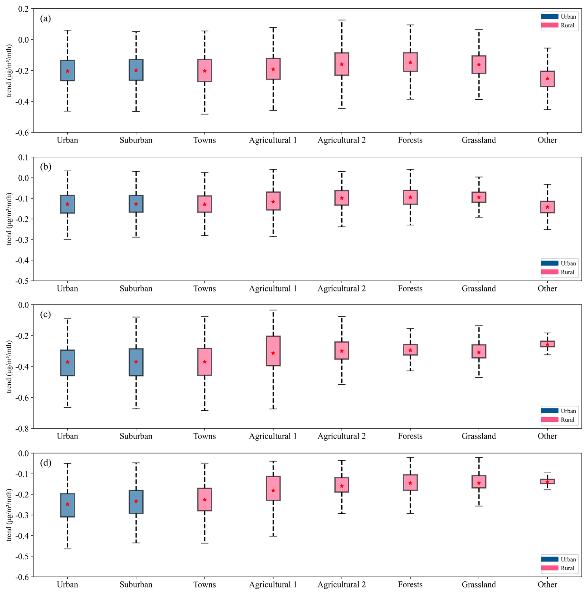Urban and rural areas, categorized by land cover type, comprised eight different categories. The study assessed their respective roles in PM concentration reduction trends and found that all eight categories showed declining PM trends. However, the regions with the highest PM reduction trends were mainly four types: urban core areas, suburbs, towns and agricultural land 1 (high agricultural pressure). In contrast, the reduction trends were less pronounced in agricultural land 2 (low agricultural pressure), forests, grassland and other areas.