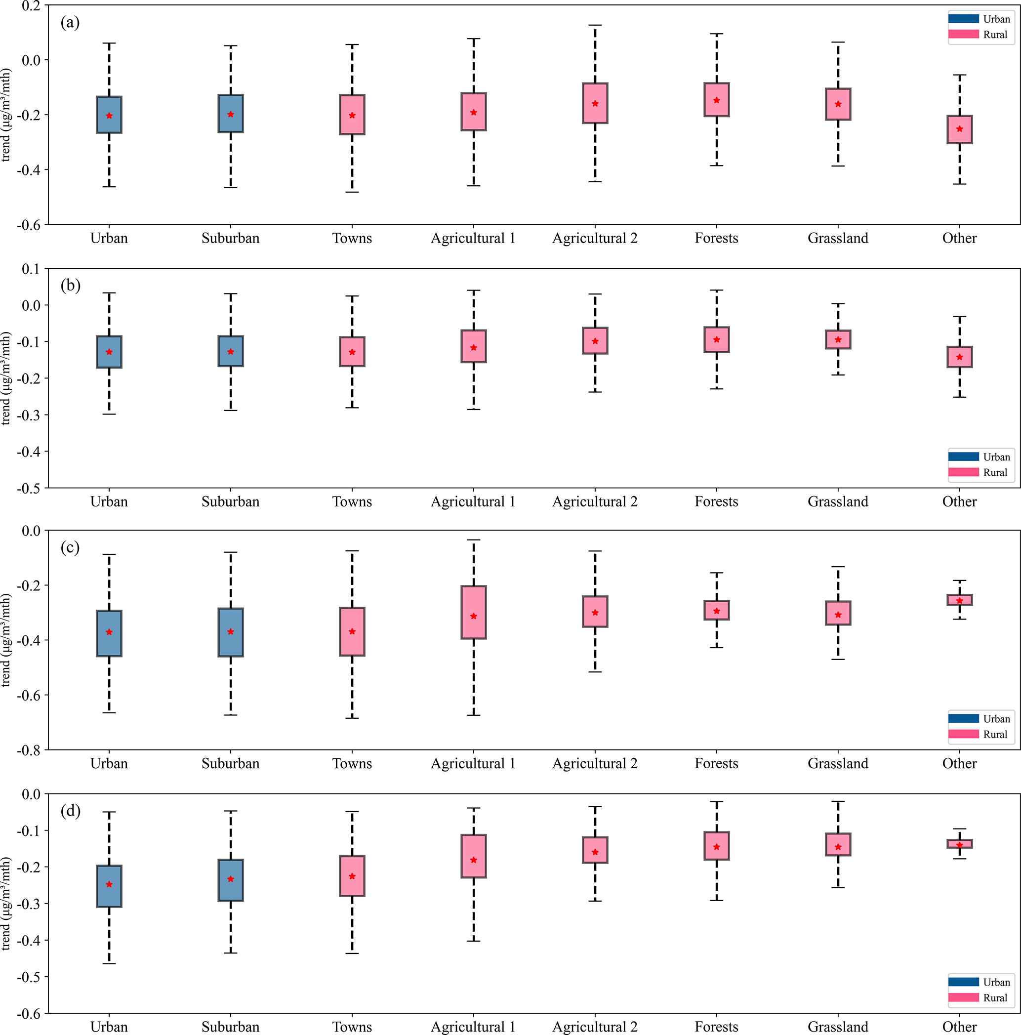 Figure 8Trends in the relative contribution (a–b) and SHAP values (c–d) of interannual variability of different land cover types. (a) and (c) represent the case for PM10, while (b) and (d) represent the case for PM2.5. In the legend, blue represents urban areas, and red represents rural areas. In Fig. 8, the upper part of the box represents the upper quartile of the trend, and the lower part represents the lower quartile of the trend; the dotted line range represents the upper and lower limits of the trend values; the red dot represents the average value of the trend.