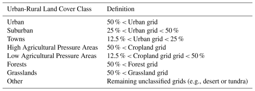 Zhang et al. (2022b) proposed a method to differentiate urban and rural areas based on the gradient of human land use pressure. In this study, the MCD12Q1 land cover map, with a spatial resolution of 500 m was used. For grids measuring 5 × 5 km, urban and rural classifications were determined by the coverage of specific land cover categories (e.g., urban land and cropland), which reflect the transition from urban to rural areas and correspond to different levels of human activity. As shown in Table 1 and Fig. S1 in the Supplement, urban areas in this study include both urban core areas and suburban regions, while rural areas are categorized into six types: towns, high agricultural pressure areas, low agricultural pressure areas, forests and grasslands.