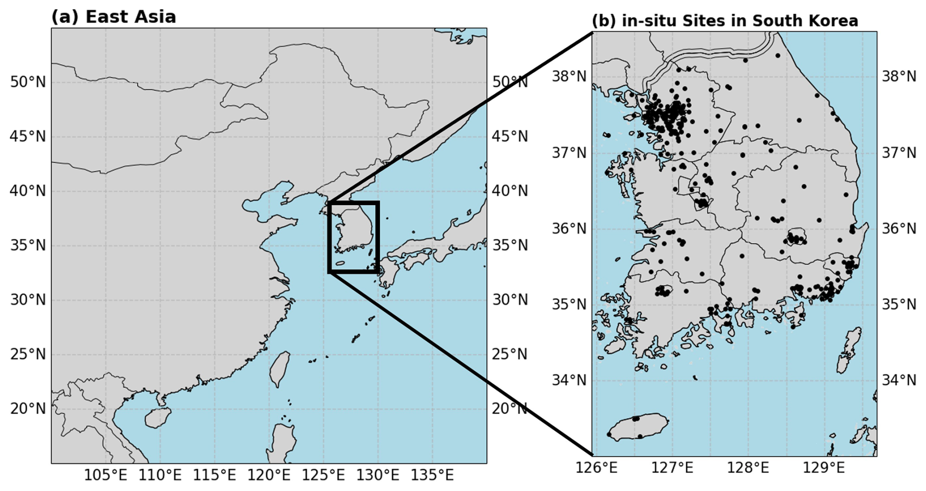 Figure 1(a) The location for South Korea in East Asia and (b) the locations for in-situ air pollutant measurements in South Korea.