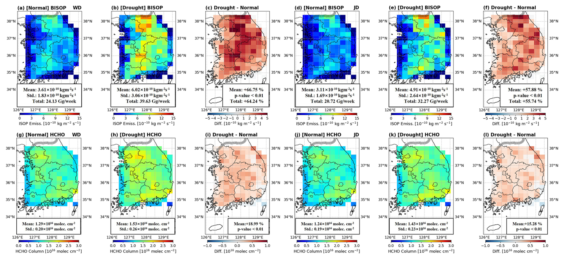 Figure 4The biogenic isoprene emissions (BISOP) in WD under (a) the normal condition, (b) the drought condition, and (c) the difference (drought – normal). (d–f) Same as (a)–(c) but in JD. The HCHO column in WD under (g) the normal condition, (h) the drought condition, and (i) the difference (drought – normal). (j–l) Same as (g)–(i) but in JD. The mean and standard deviation (Std.) is presented in each panel and p-value for the mean difference was derived from Student's t-test.