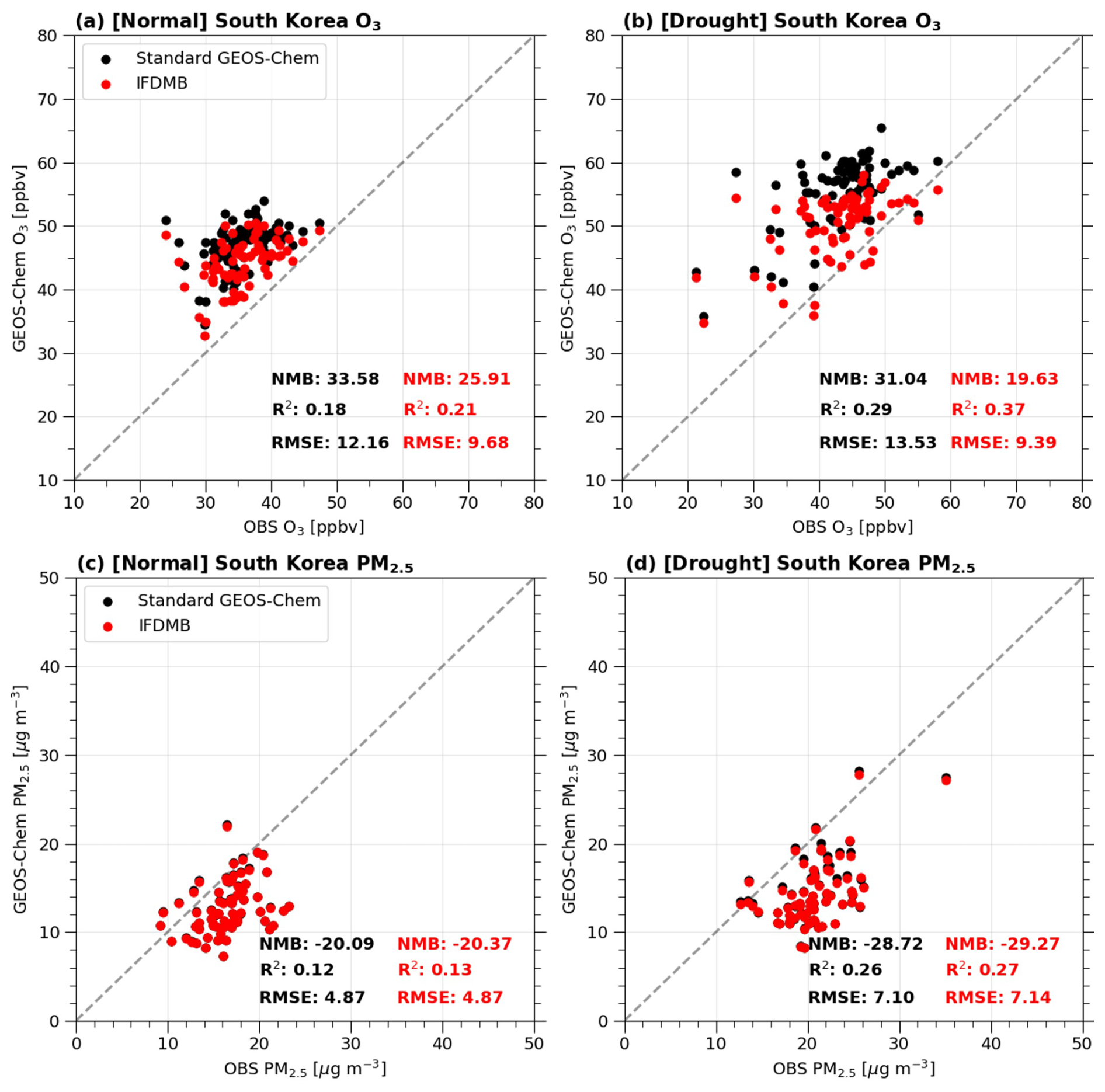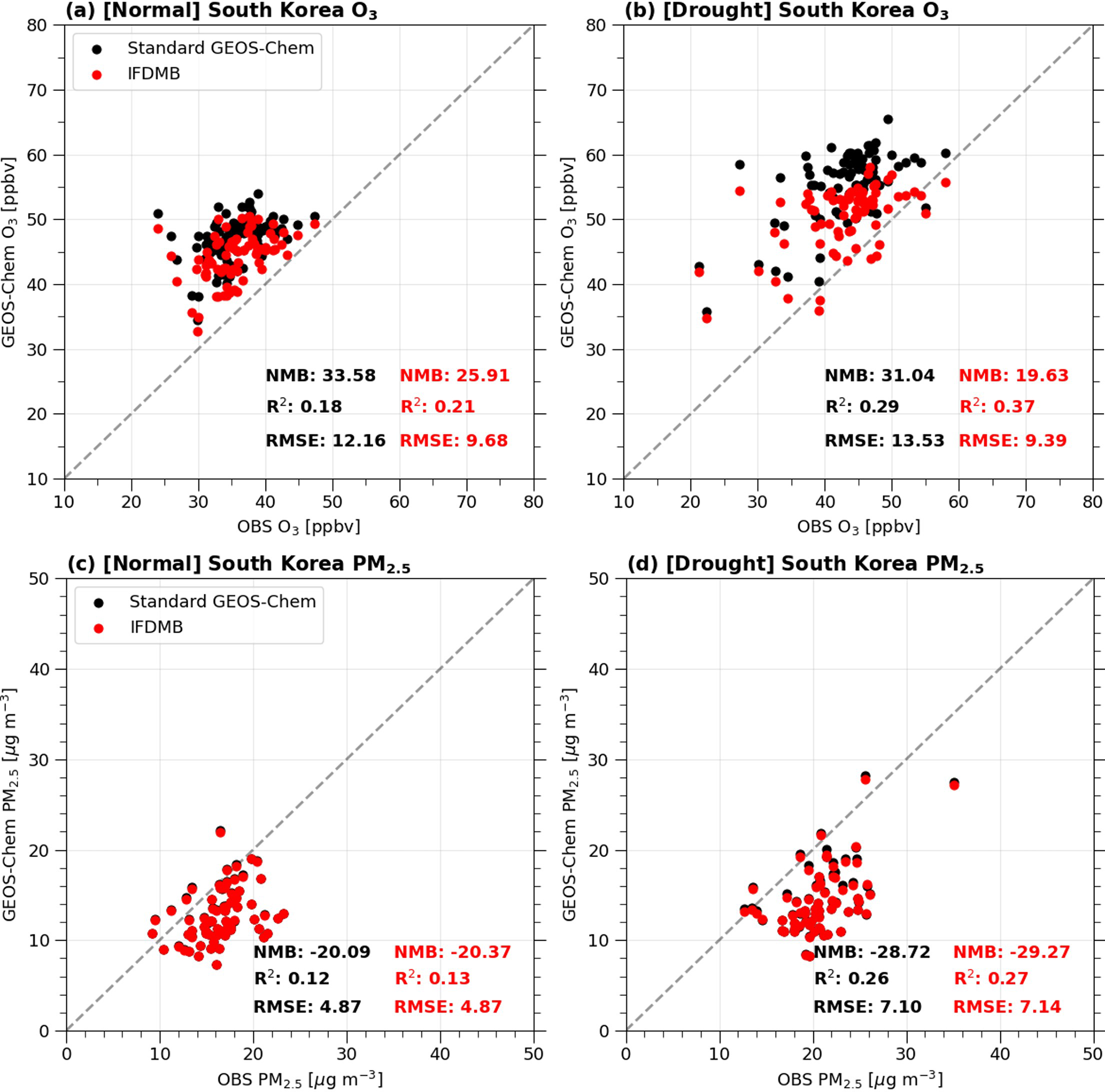 Figure 6The scatter plot for the observed O3 and the simulated O3 under (a) the normal and (b) drought conditions. Black and red dots denote standard GEOS-Chem and IFDMB, respectively. Normalized mean bias (NMB), coefficient of determination (R2), and root mean square error (RMSE) for the standard GEOS-Chem (black) and IFDMB (red) are presented in each panel. The gray dotted line is 1:1 line. (c–d) Same as (a)–(b) but for PM2.5.