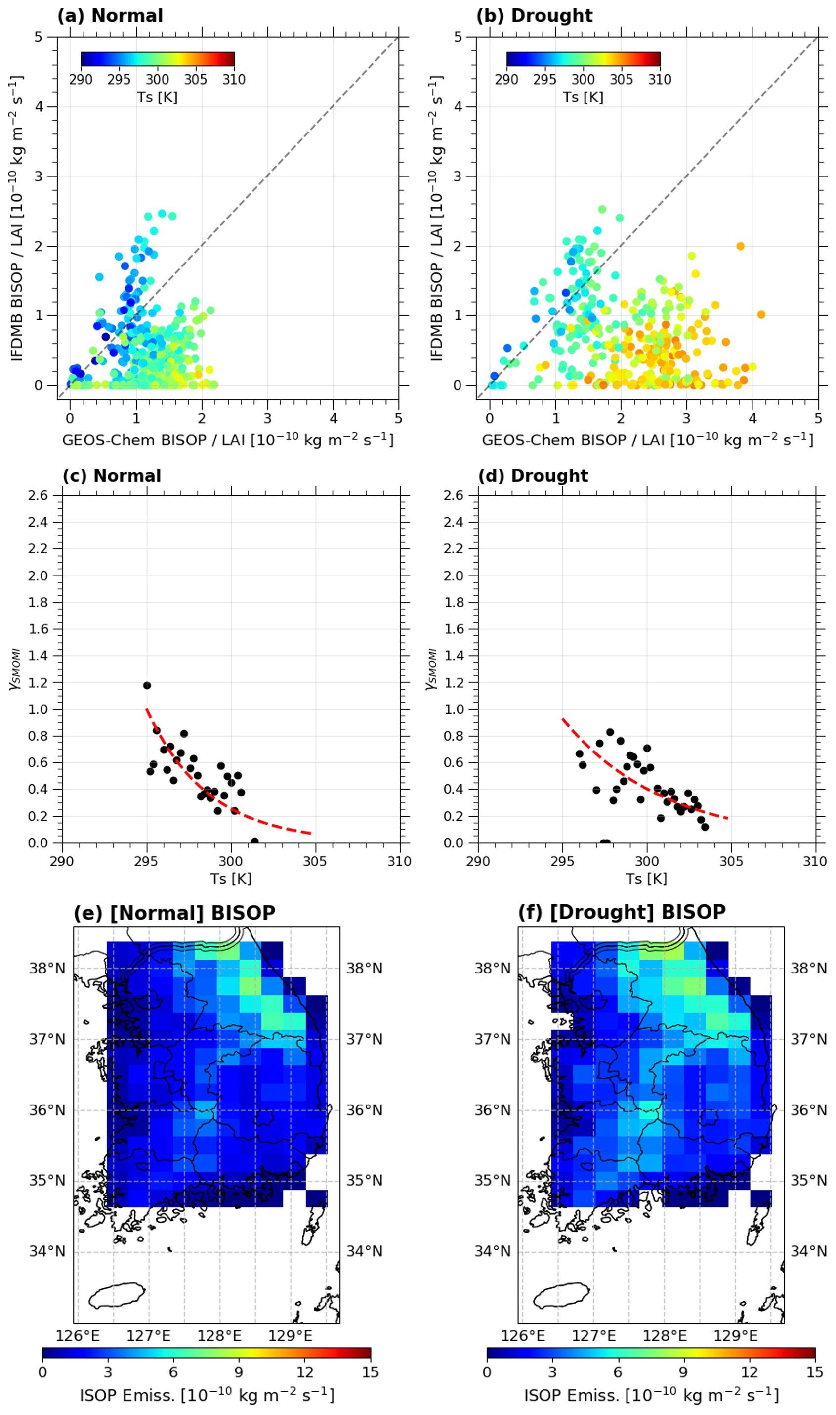 Figure 7The scatterplots between biogenic isoprene emissions in the standard GEOS-Chem and those in IFDMB under (a) the normal and (b) the drought conditions. Each dot represents isoprene emission value in the standard GEOS-Chem versus that in IFDMB at each grid point in South Korea. Here, the biogenic isoprene emissions were divided by LAI to consider the different vegetation coverage. The surface temperature was overlaid at each grid point. The gray dotted line is 1:1 line. γSM_OMI with respect to the surface temperatures with an interval of 0.2 K in (c) the normal and (d) the drought conditions. The red dotted lines indicate the fitted lines. The raw data points before binning in 0.2 K are provided in Fig. S9. The adjusted biogenic isoprene emissions by the empirical equations for γSM_OMI under (e) the normal and (f) the drought conditions.
