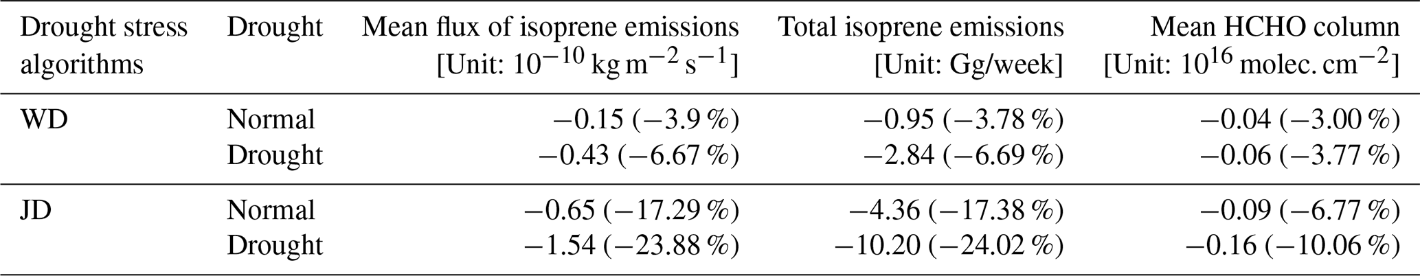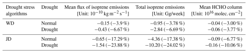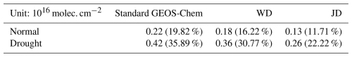 Based on the above discussions, the larger HCHO column bias under the drought condition was likely caused by the model overestimation (71.5 % increase) of isoprene emissions under the drought condition in South Korea. As described in Sect. 2.4, MEGAN2.1 implementation in the standard GEOS-Chem model does not have the soil moisture parameter and hence overestimates isoprene emissions under the drought condition. The drought stress algorithms (i.e., WD and JD; Sect. 2.4) were developed to address this caveat. For example, Wang et al. (2022b) showed that the increases of isoprene emissions under the SE US drought condition were 22.7 %–56 % in GEOS-Chem and those were reduced to 15.2 %–35.23 % after implementing their drought stress algorithm. Given this, we implemented two existing drought stress algorithms (WD and JD; Sect. 2.4) in the following section and investigated whether they could reduce the overestimation of isoprene emissions and correct the HCHO column bias under the drought condition in South Korea.