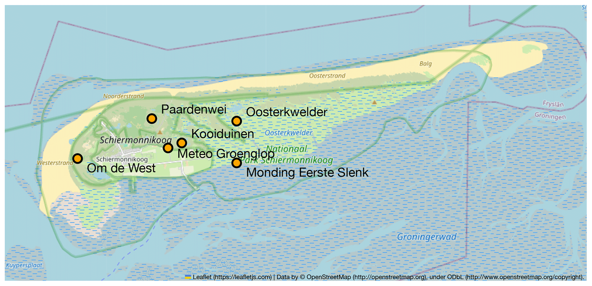 Figure 1The map of Schiermonnikoog, in which the orange circles denote the MAN measurement sites, is provided by © OpenStreetMap contributors (2017). Distributed under the Open Data Commons Open Database License (ODbL) v1.0.