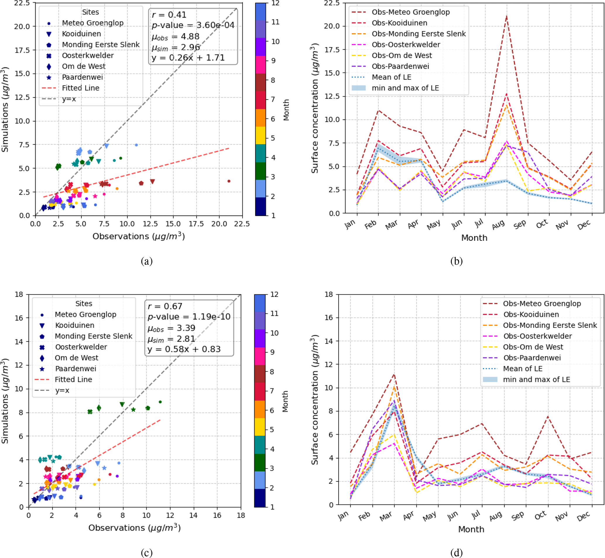 Furthermore, possible timing discrepancies in passive sampler collection, where measurements may not align precisely with calendar months, introduce additional uncertainty when comparing observations to model outputs. These issues highlight the need for refined emission timing, better spatial resolution, and improved observation methodologies to enhance simulation-observation agreement.