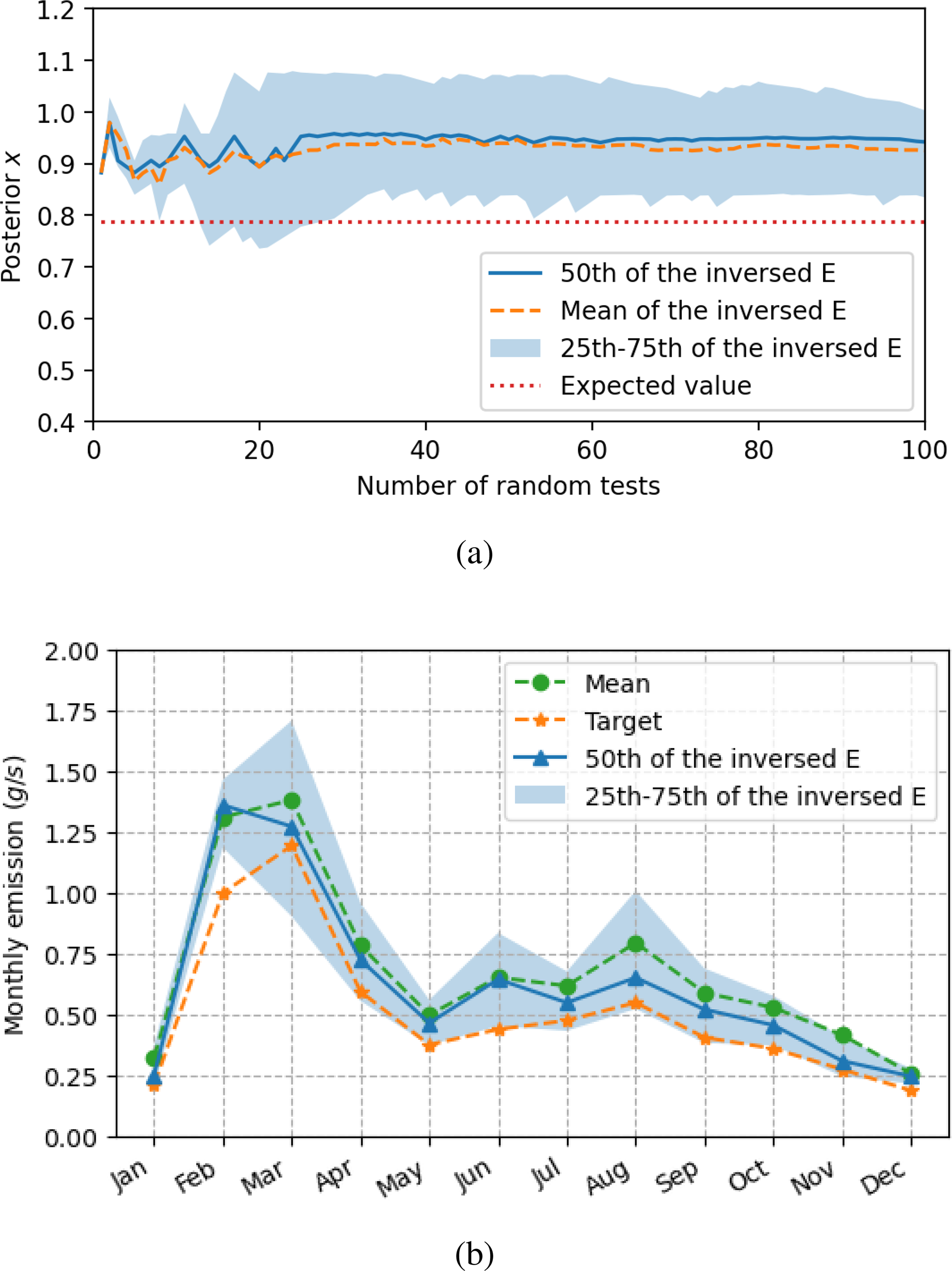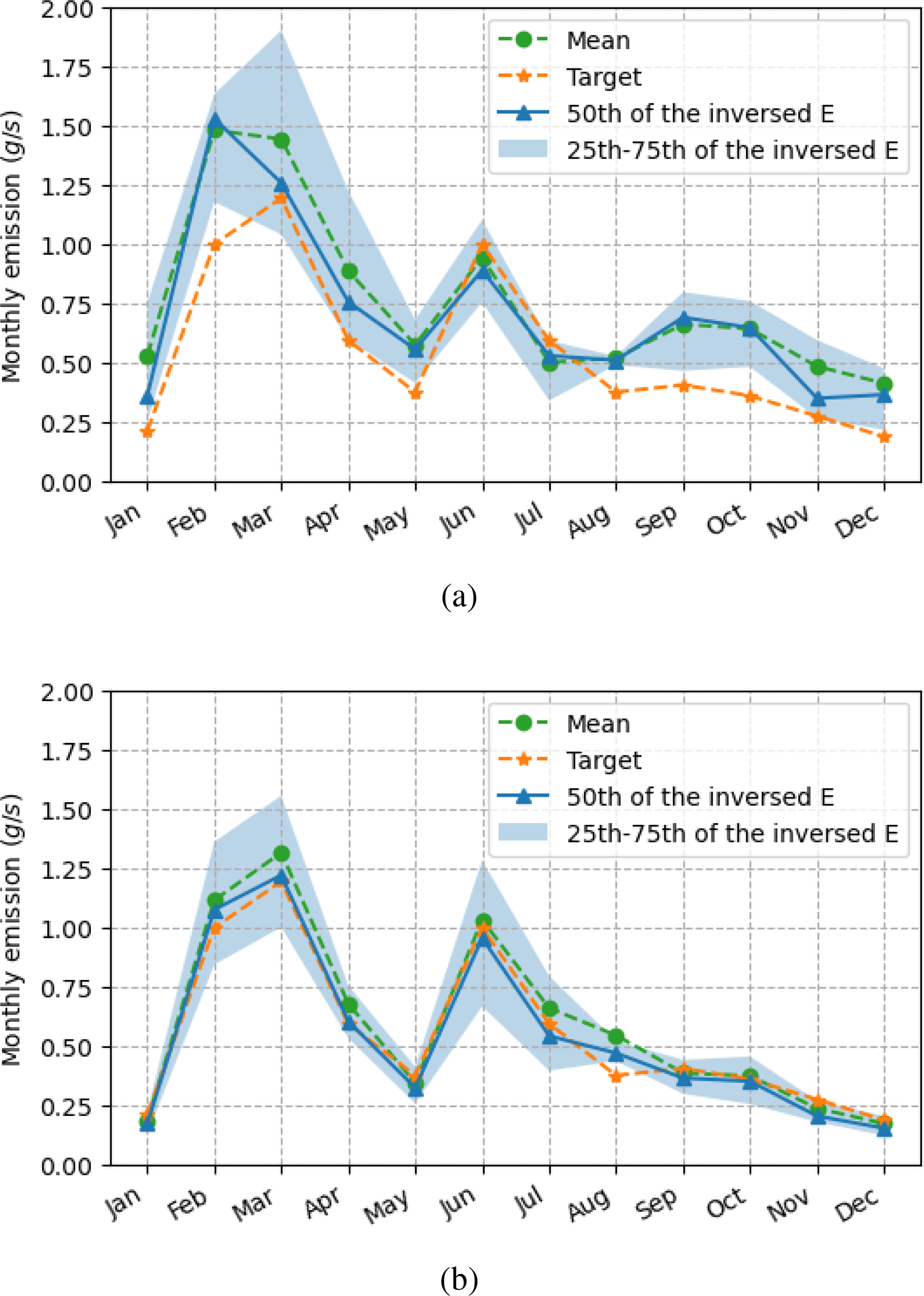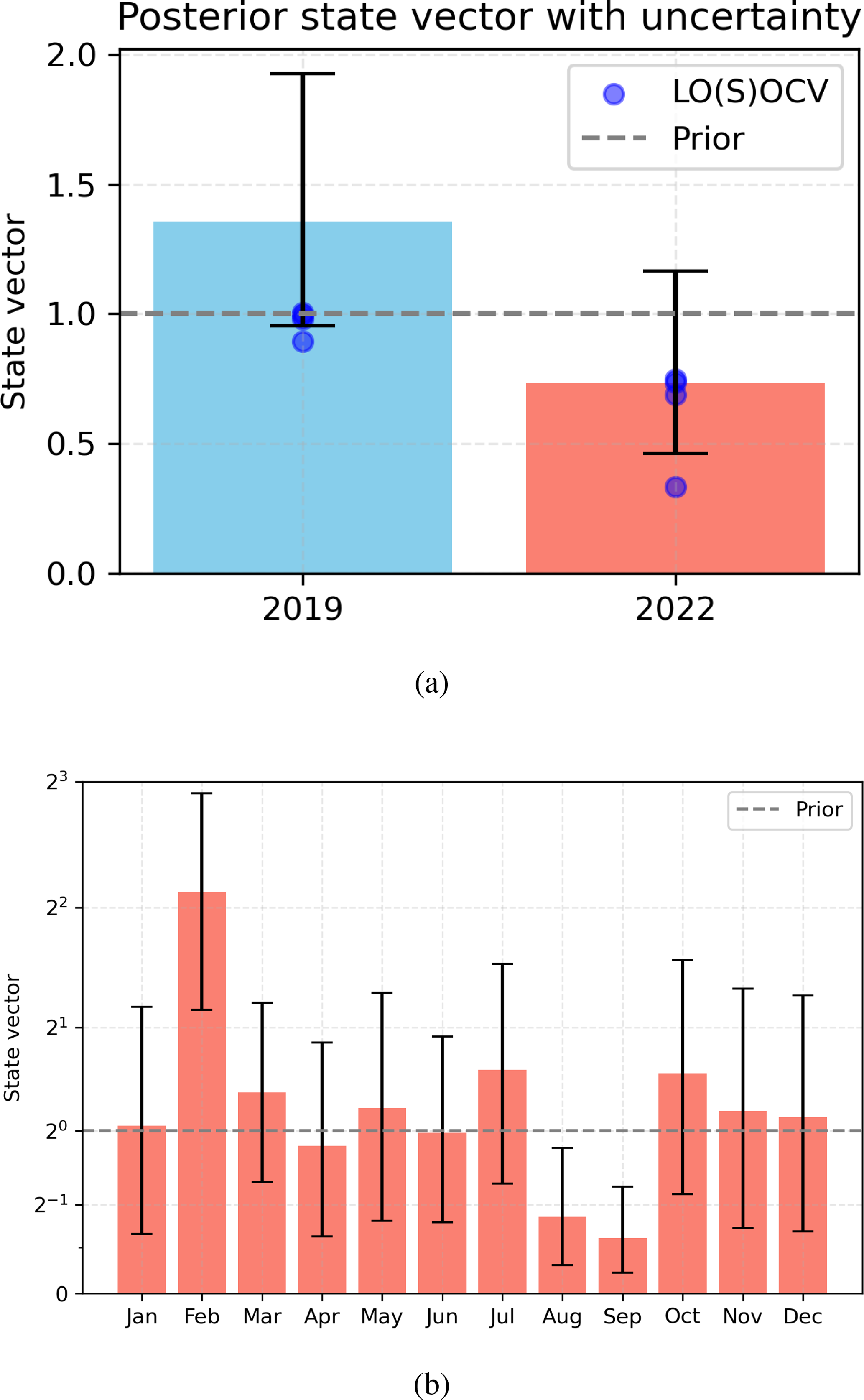 Figure 10The monthly inversion in 2022 with synthetic measurements and a synthetic summer peak. The observational error for the synthetic LML-like measurement is set at 3.5 %. Panel (a) shows the posterior emission with the current MAN network. Panel (b) shows the posterior emission after adding one LML-like measurement.