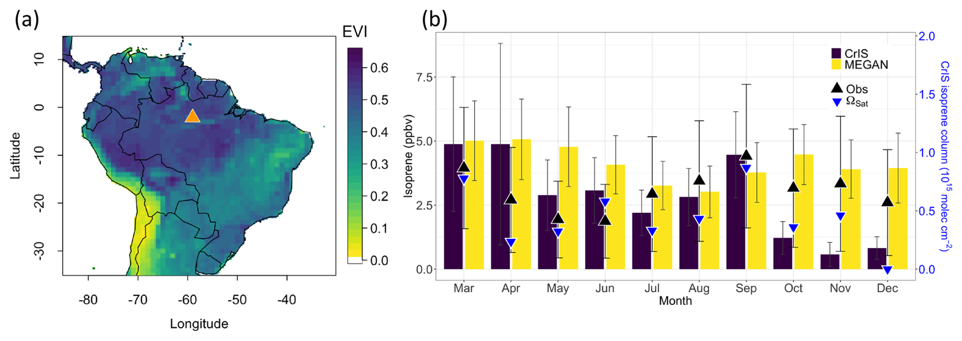 Figure 3(a) Annual mean values of the enhanced vegetation index (EVI) from MODIS. The ATTO site is marked by an orange triangle. (b) Model (bars) and observed (triangles) monthly mean isoprene mixing ratios (ppbv) at the ATTO site during March–December 2019. Model values are driven by MEGAN and by values determined by the CrIS satellite data. Vertical lines denote the standard deviations of the monthly means. Blue triangles denote CrIS isoprene columns at the ATTO site.