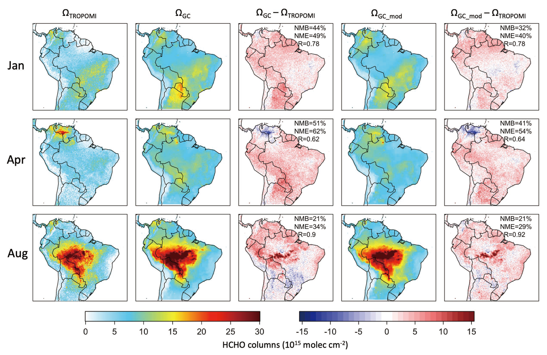 Figure 4TROPOMI (first column) and GEOS-Chem monthly mean HCHO columns (1015 molec. cm−2) for January, April, and August in 2019. The GEOS-Chem model columns driven by MEGAN (second column) and by CrIS-derived isoprene emission estimates (fourth column). Differences between TROPOMI and model values are shown in the third and fifth columns. The values in the panels in the third and fifth columns are the normalized mean biases (NMBs), normalized mean error (NME), and Pearson correlation coefficients (R).