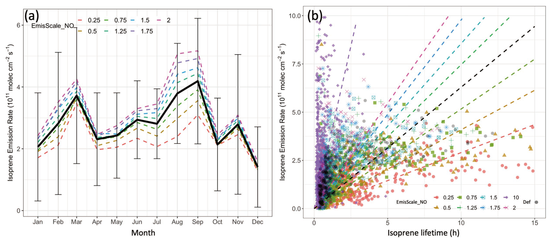 Figure 5(a) Monthly mean CrIS-based isoprene emission rates (Eisop, 1011 molec. cm−2 s−1) over the Amazonian region under different NOx emission levels. Black line indicates the monthly mean with standard deviations of the default case (EmisScale_NO = 1). (b) Annual mean CrIS-derived isoprene emission rates vs. isoprene midday lifetime under different NO2 emission levels over tropical South America. Default CrIS isoprene emission rates are shown in black.