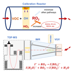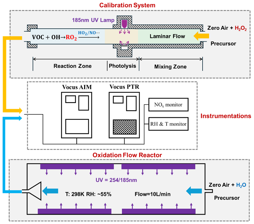 In addition to Vocus AIM mentioned above, the flow tube was surrounded by Proton-Transfer-Reaction Mass Spectrometry (PTR-MS), monitoring precursors and other gas-phase products. HO2 radicals were also measured using Vocus AIM. Recent literature has discussed the measurement of HO2 radicals using Br-CIMS (Wang et al., 2024a). Since I and Br have similar chemical properties, Vocus AIM can theoretically also measure HO2 radicals and we calibrated the Vocus AIM using a HO2 standard generator and validated the calibration through comparison with laser-induced fluorescence (Fig. S5 in the Supplement). NOx, RH, and temperature were also monitored during the experiments.