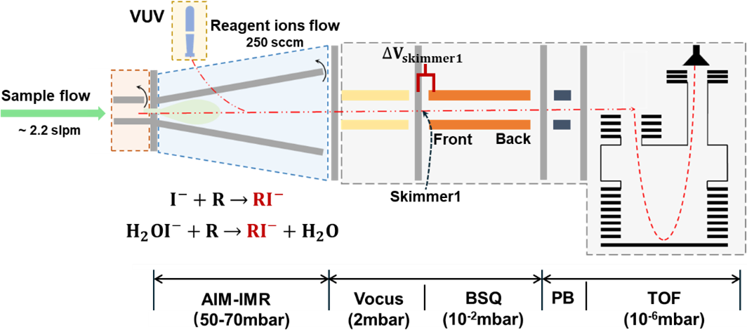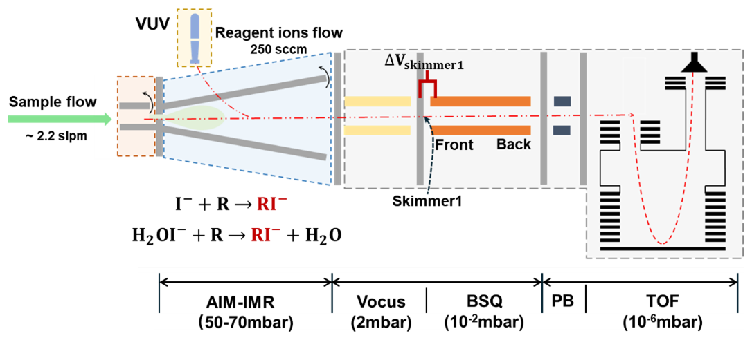 Vocus AIM supports various reagent ions of both positive and negative polarity and we chose I as reagent ions to detect RO2 radicals here. As Fig. 1 shows, Iodine reagent ions (I) were generated by passing a 250 sccm (standard cubic centimeter per minute) ultra-high purity nitrogen stream, carrying trace amounts of methyl iodide and benzene (released from a permeation tube held at 80 °C), through a vacuum ultraviolet (VUV) source connected to IMR. A 2.2 slpm (standard liters per minute) sample flow was introduced into the IMR and intermingled with the I reagent ion flow to produce molecular-ions. Then ions were guided into the Vocus, big segmented quadrupole (BSQ), primary beam (PB) chamber and ToF analyser. The instrument can achieve a mass resolution of  10 000 at 100–500 Th and a total ion count of  2 000 000 cps.