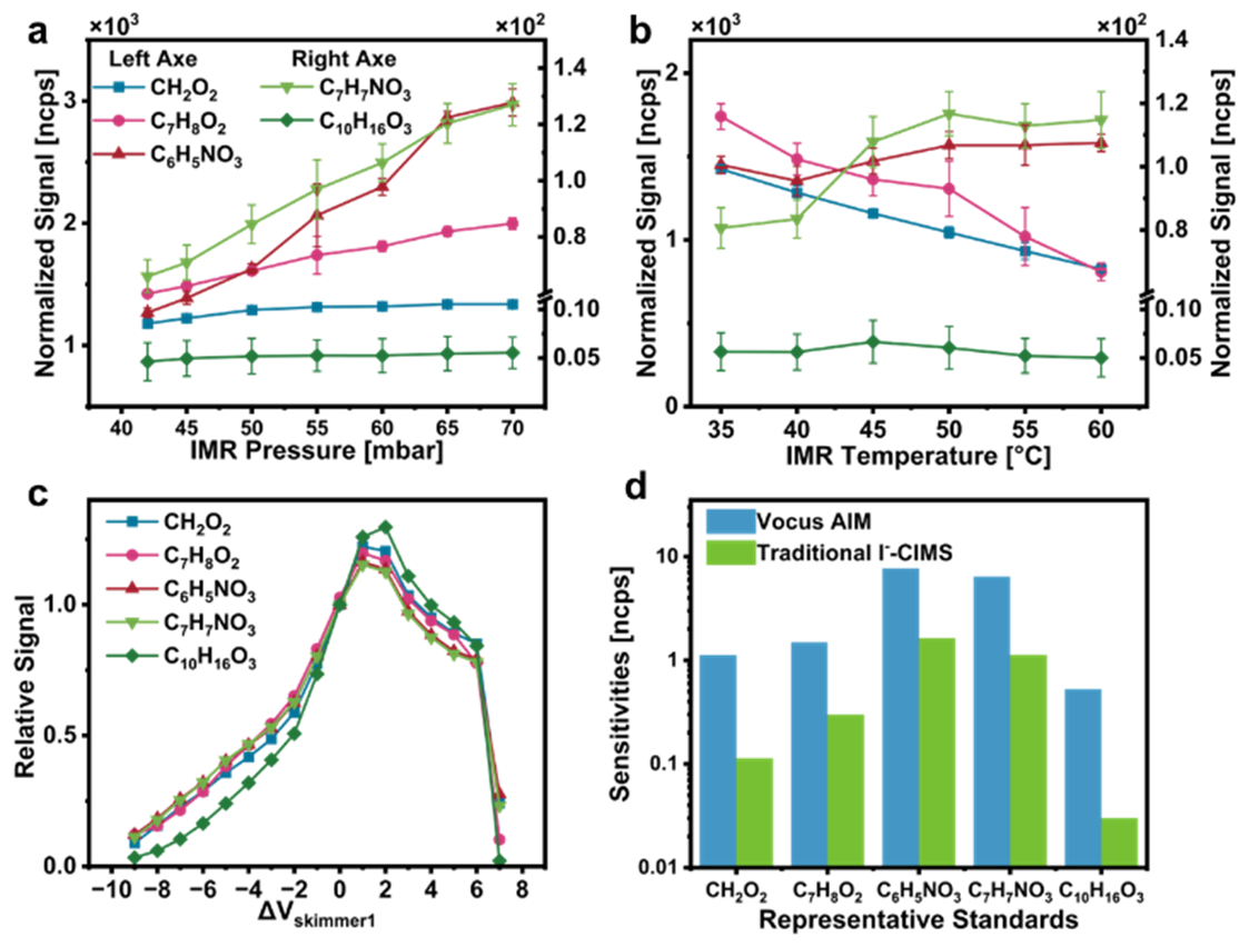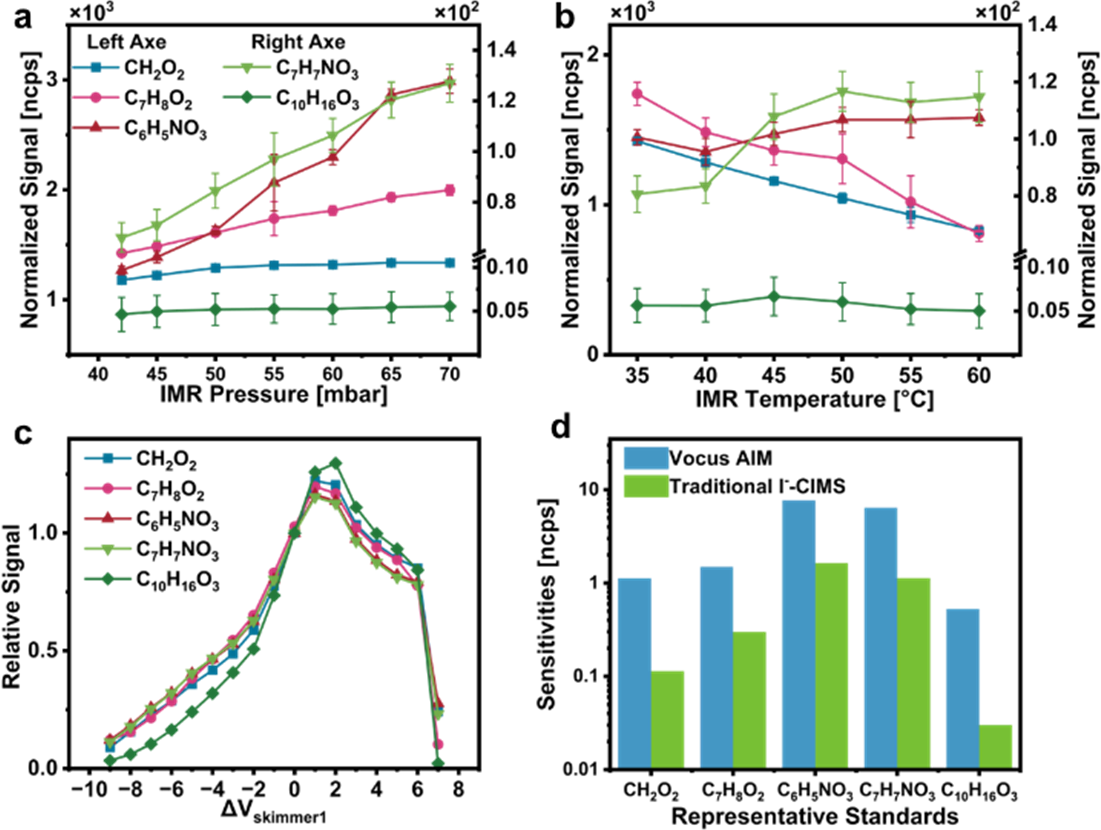 Figure 3The optimization results: the dependence of instrument sensitivities of representative standards on the instrumental conditions, (a) IMR pressure, (b) IMR temperature, (c) voltage of skimmer in the BSQ and (d) the comparison of sensitivities in optimized Vocus AIM and traditional I-CIMS.