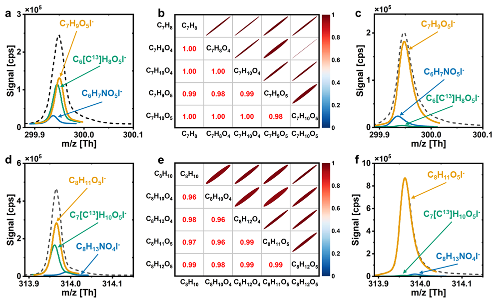 Figure 4Peak fitting result for BPRs in the oxidation of (a) toluene, (d) m-xylene with H2O photolysis the sole source of OH, correlation analysis of BPRs, precursors and products (b, e) and improvement in the peak fitting after adding H2O2 (c, f).