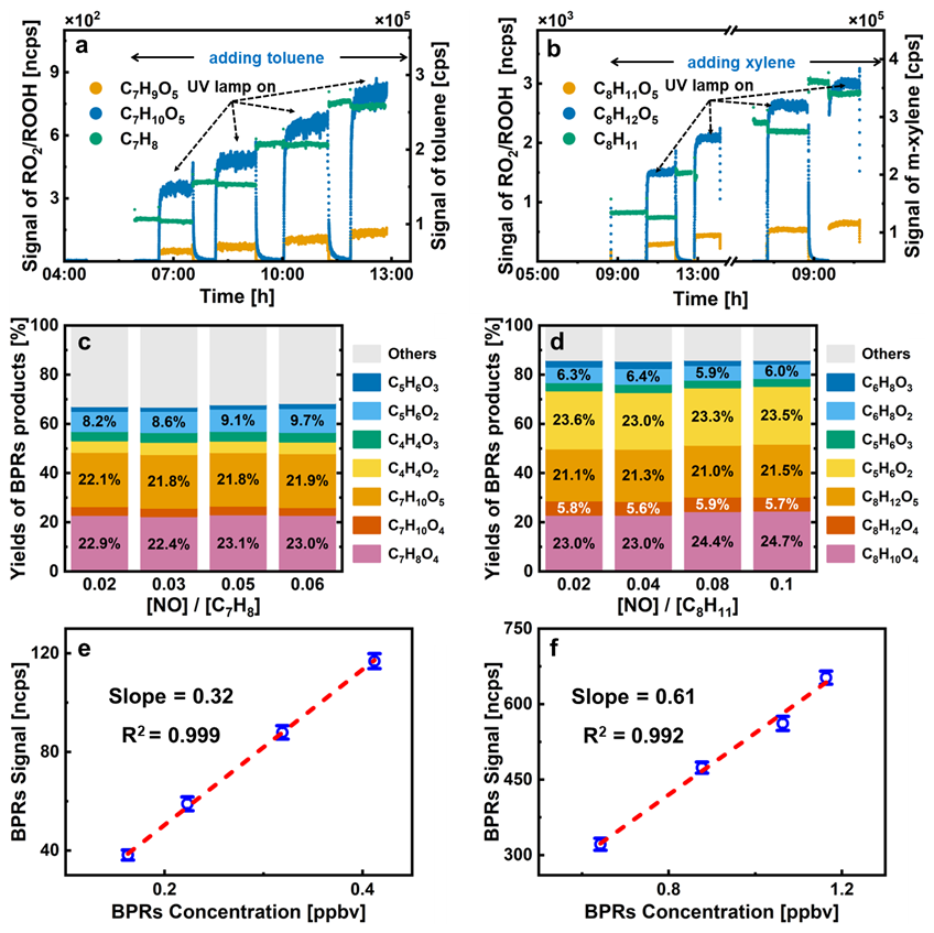 Here, we present the recently developed CIMS equipped with an AIM (Adduct Ionization Mechanism) ion-molecule reactor (Tofwerk AG, hereafter referred to as Vocus AIM), which has demonstrated enhanced sensitivity toward trace reactive oxygenated gaseous species (Riva et al., 2024; Aggarwal et al., 2025). In this work, the key instrumental parameters influencing the sensitivity to BPRs were systematically identified and optimized. A calibration system based on a flow reactor was then established to generate pure and stable concentrations of RO2 radicals through the OH-initiated oxidation of toluene and m-xylene. The corresponding mass spectral signals were clearly resolved, and potential interferences from nitrogen-containing species and isotopic overlaps were carefully examined. Furthermore, we successfully quantified the instrumental sensitivities toward BPRs by selectively controlling the reaction pathways and assessed the associated uncertainties of the measurement method. Building upon this direct quantification approach, we further investigated the product yields and mechanism in aromatic oxidation, offering new experimental insights into the peroxide–bicyclic pathway.