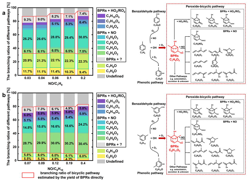 where [X] and [RO2] represent the concentrations of the precursor and RO2 radicals, respectively, and ksource and ksinks represent the total formation and removal rate constants of RO2, respectively. As illustrated in Schemes S1, S2, the OH-initiation oxidation of aromatics involves multiple pathways like bicyclic pathway, phenolic pathway and benzaldehyde pathway, and BPRs are the primarily radicals of bicyclic pathway. Consequently, it is imperative to ascertain the branching ratio of the bicyclic pathway, designated as α,