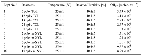 A series of photooxidation experiments of toluene and m-xylene were conducted under typical low-NOx conditions in an oxidation flow reactor (OFR) to directly investigate the oxidation mechanisms of aromatic hydrocarbons. Unlike previous studies (He et al., 2023; Xu et al., 2020), which primarily inferred the fate of BPRs from the trace products, the present work directly quantified the concentrations and formation yields of BPRs, as well as the branching ratio of the bicyclic pathway, based on the calibrated method described above. The main sector of OFP, as illustrated in the lower part of Fig. 2, was a 100 cm long, 9.6 cm inner diameter made of quartz glass (Yu et al., 2022; Watne et al., 2018). The reactor was illuminated by two Philips TUV 30 W fluorescent lamps emitting at 185 nm, enclosed within an aluminium mirror compartment to minimize photon field inhomogeneities. Aromatic hydrocarbon precursors (1–30 ppbv), mixed with 7 slpm of humidified zero air, were introduced into the front of the reactor. Additionally, 3 slpm of zero air was used as sheath flow to reduce wall losses. The residence time within the reactor was maintained at  90 s. OH radical concentrations were calibrated by monitoring the decay of precursors and typically ranged from 8×108 to 4×109 molec. cm−3 during the oxidation experiments, with temperature and relative humidity kept at 26 ± 1 °C and 45 ± 5 %, respectively. More details about the oxidation experiments have been listed in Table 1.