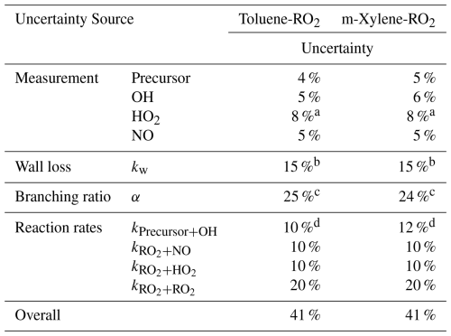 For the measurement of precursors and products using Vocus AIM and Vocus PTR in the first part, the primary source of uncertainty was sensitivity determination. For the calibrated compounds in this study, the uncertainty in measured sensitivities is relatively small, ranging from 5 % to 15 %. For uncalibrated compounds, sensitivity uncertainties are high, between 10 % and 35 %, primarily owing to uncertainties in the ion–molecule reaction rate constants, relative transmission efficiency, and fragmentation fraction (for details, see Sects. S1 and S2). The measurement errors for HO2 and NO were referenced in the literature (Wang et al., 2024a) and specified in the official manuals, respectively. As the OH concentration is determined from the decay of its precursor, the uncertainty in OH concentration is derived based on the measurement uncertainty of the precursor.