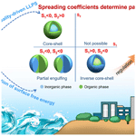 Here, the inorganic, organic, and gas phases are labeled as phases 1, 2, and 3, respectively. Therefore, S1 reflects the spreading of the inorganic phase on the organic liquid, while S2 represents the spreading of the organic phase on the inorganic phase. For two immiscible phases, the energy recovered from the loss of the organic-air surface is typically insufficient to offset the cost of forming a larger inorganic/organic interface and an inorganic surface, resulting in generally negative S1 values (Reid et al., 2011; Kwamena et al., 2010). Conversely, the energy recouped from the loss of inorganic-air surface allows the organic phase to fully or partially spread over the inorganic phase, leading to core-shell or partial engulfing structures, as indicated by positive or negative S2 values, respectively.