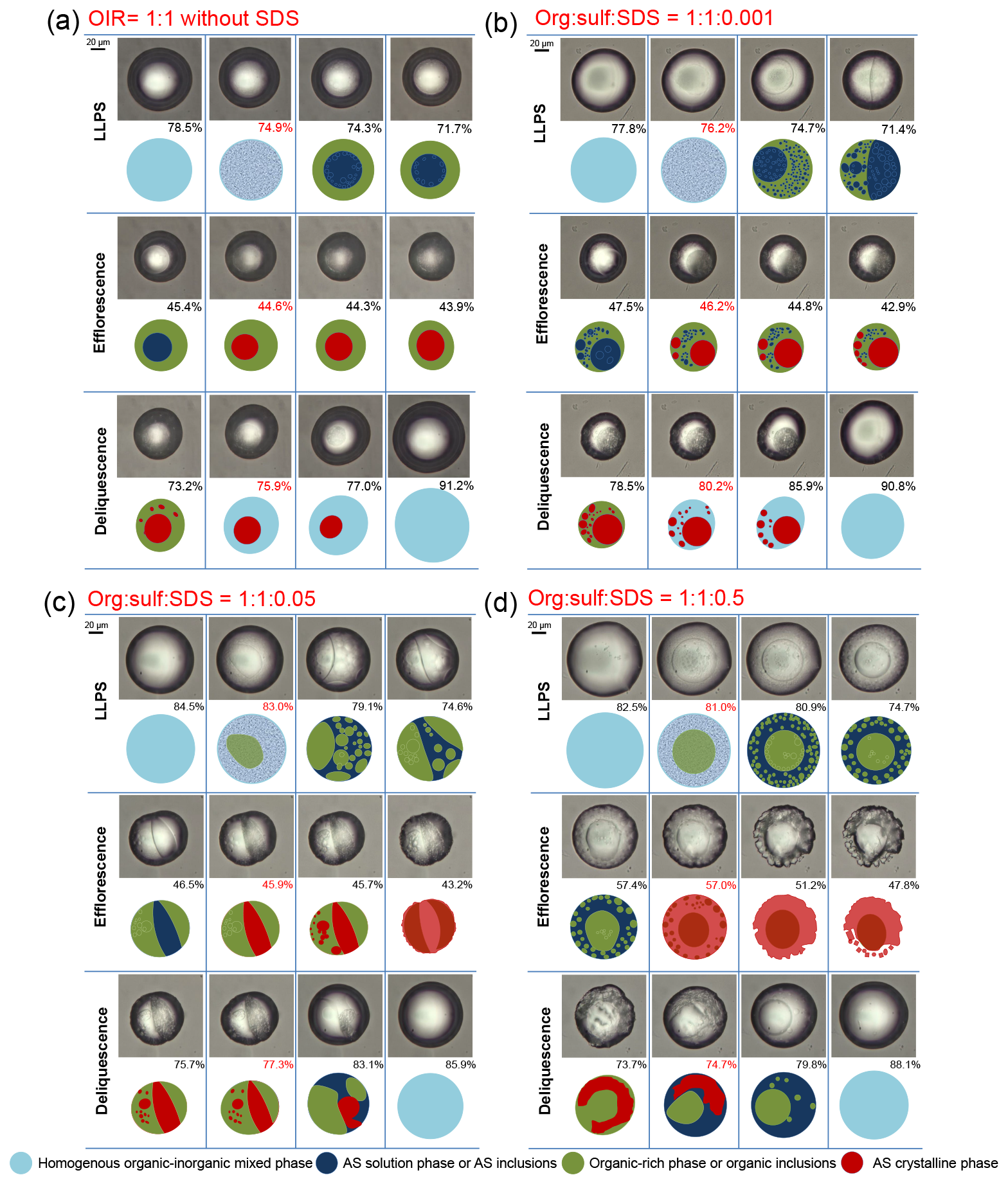 Figure 1Optical images and corresponding illustrations of mixed 1,2,6-hexanetriol/AS particles with an OIR of 1 : 1, without SDS (a), and with org : sulf : SDS ratios of 1 : 1 : 0.001 (b), 1 : 1 : 0.05 (c), and 1 : 1 : 0.5 (d), during LLPS, efflorescence, and deliquescence. The RH percentage is indicated in each frame, with specific values highlighted in red to signify the occurrence of phase transitions.