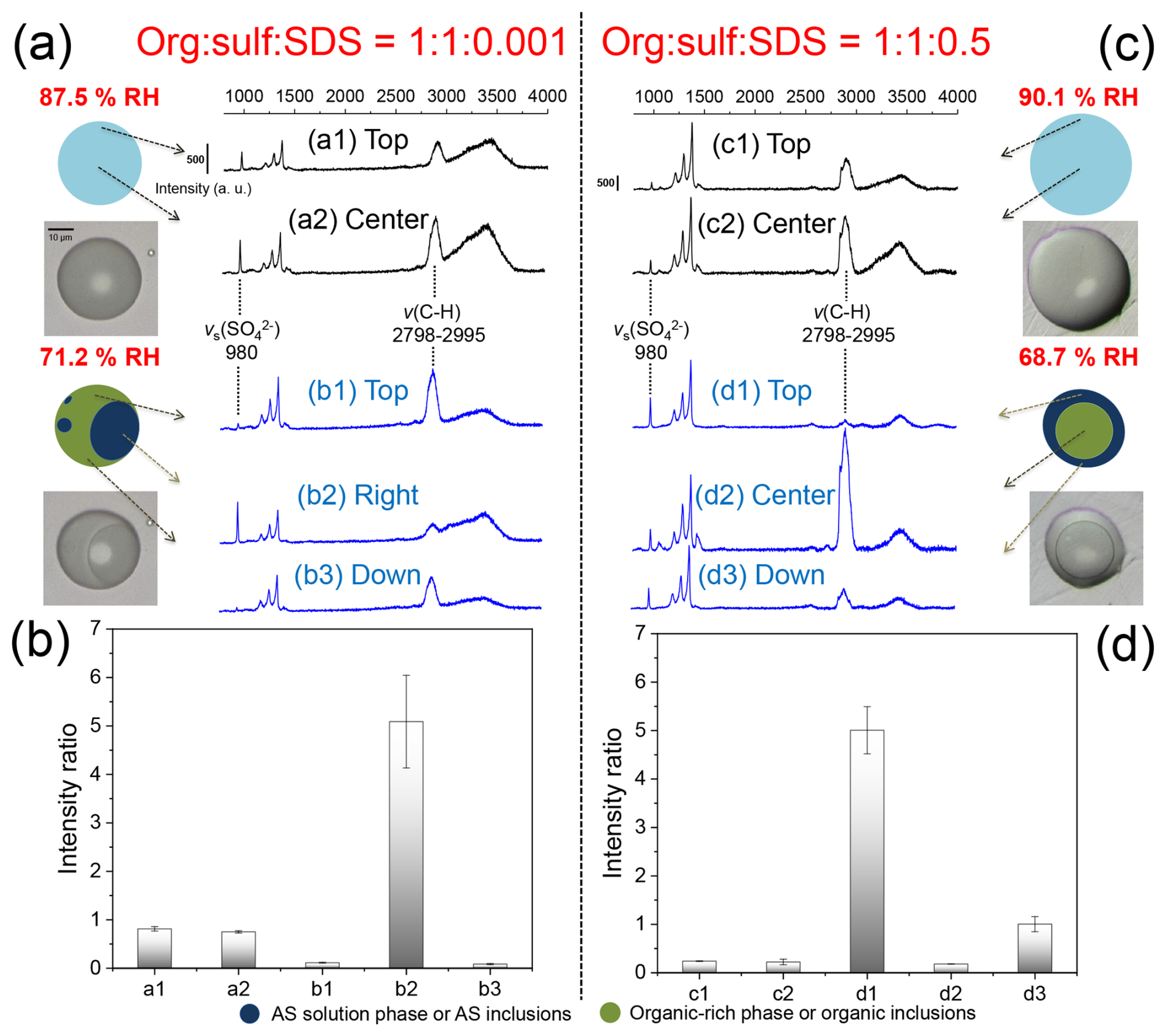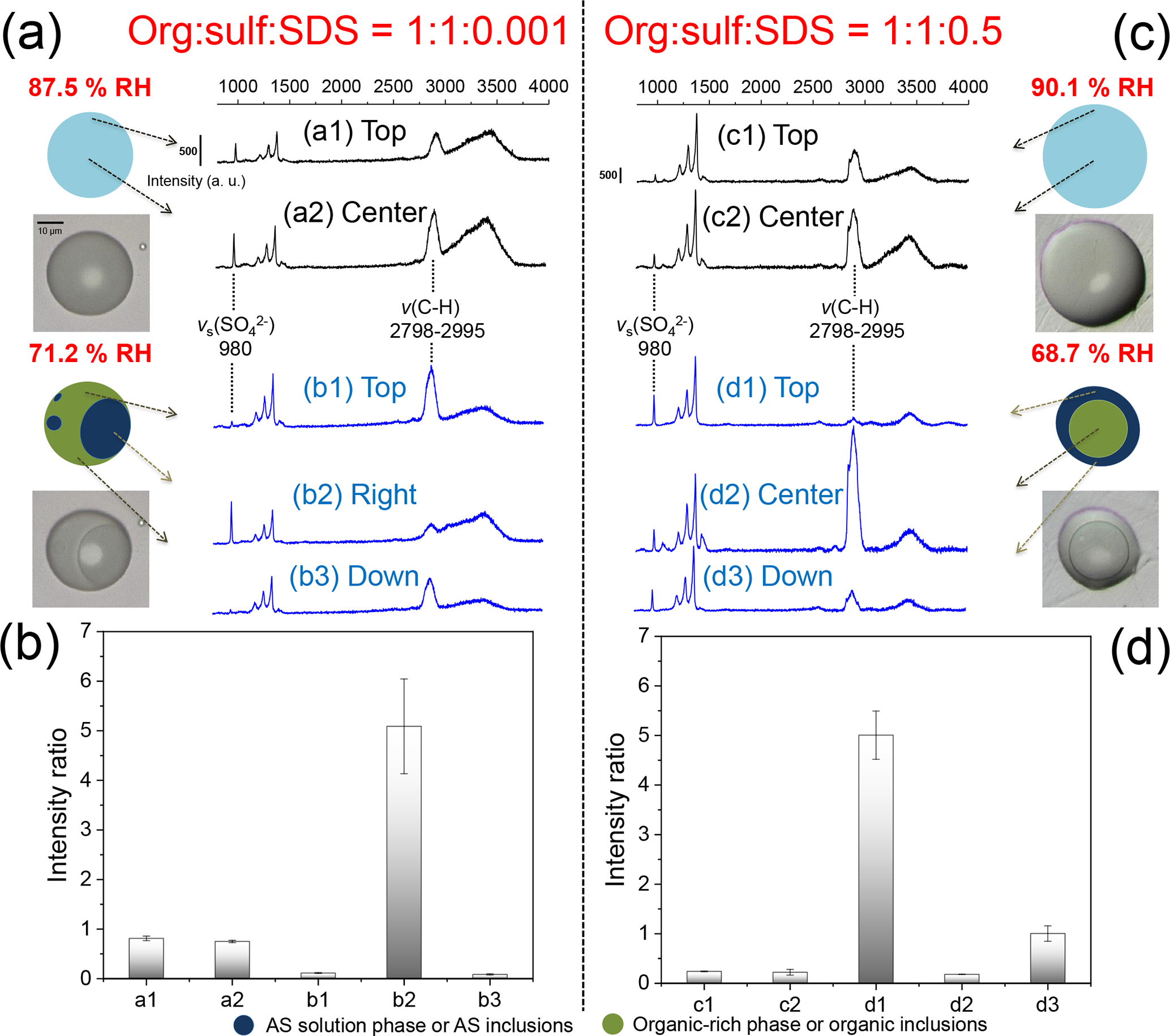 To confirm the partial engulfing and inverse core-shell structures of SDS-doped particles, spatially resolved Raman spectra were collected for org : sulf : SDS = 1 : 1 : 0.001 and 1 : 1 : 0.5 particles under specific RH conditions, as depicted in Fig. 2a and c. The spatial distribution of organic and inorganic components was determined using the intensity ratio of feature bands for AS and 1,2,6-hexanetriol (Fig. 2b and d). The symmetric stretching vibration of SO (νs (SO)) appears at 980 cm−1, while the C-H stretching vibration (ν (C-H)) of 1,2,6-hexanetriol is observed between 2798 and 2995 cm−1. At 87.5 % RH, the 1 : 1 : 0.001 particle exhibits a homogeneous mixed phase, as indicated by the similar intensity ratios of spectra a1 and a2 (0.81 and 0.75, respectively). As RH decreases to 71.2 %, a partial engulfing structure emerges. Spectra b1 and b3, from the organic-rich phase, show lower intensity ratios of 0.11 and 0.09, whereas spectrum b2, corresponding to the engulfed inorganic phase, exhibits a significantly increased intensity ratio of 5.09. This confirms the distinct separation of organic and inorganic components. However, small amounts of AS and 1,2,6-hexanetriol remain in the organic and inorganic phases, respectively, as evidenced by weak signatures of their feature bands. The O-H stretching vibration (ν (O-H)) around 3400 cm−1 in spectra b1 and b3 indicates the presence of liquid water in the organic-rich phase.