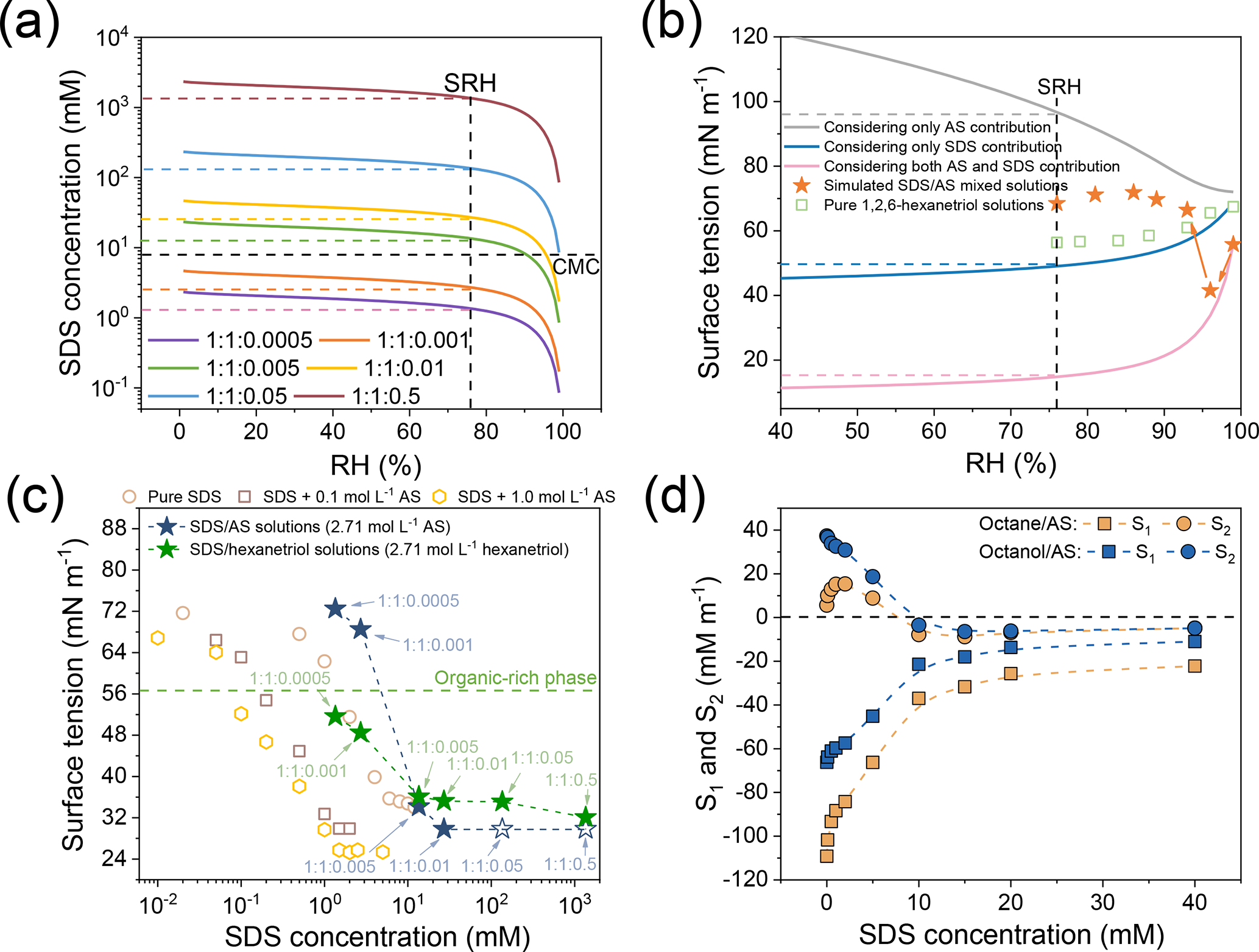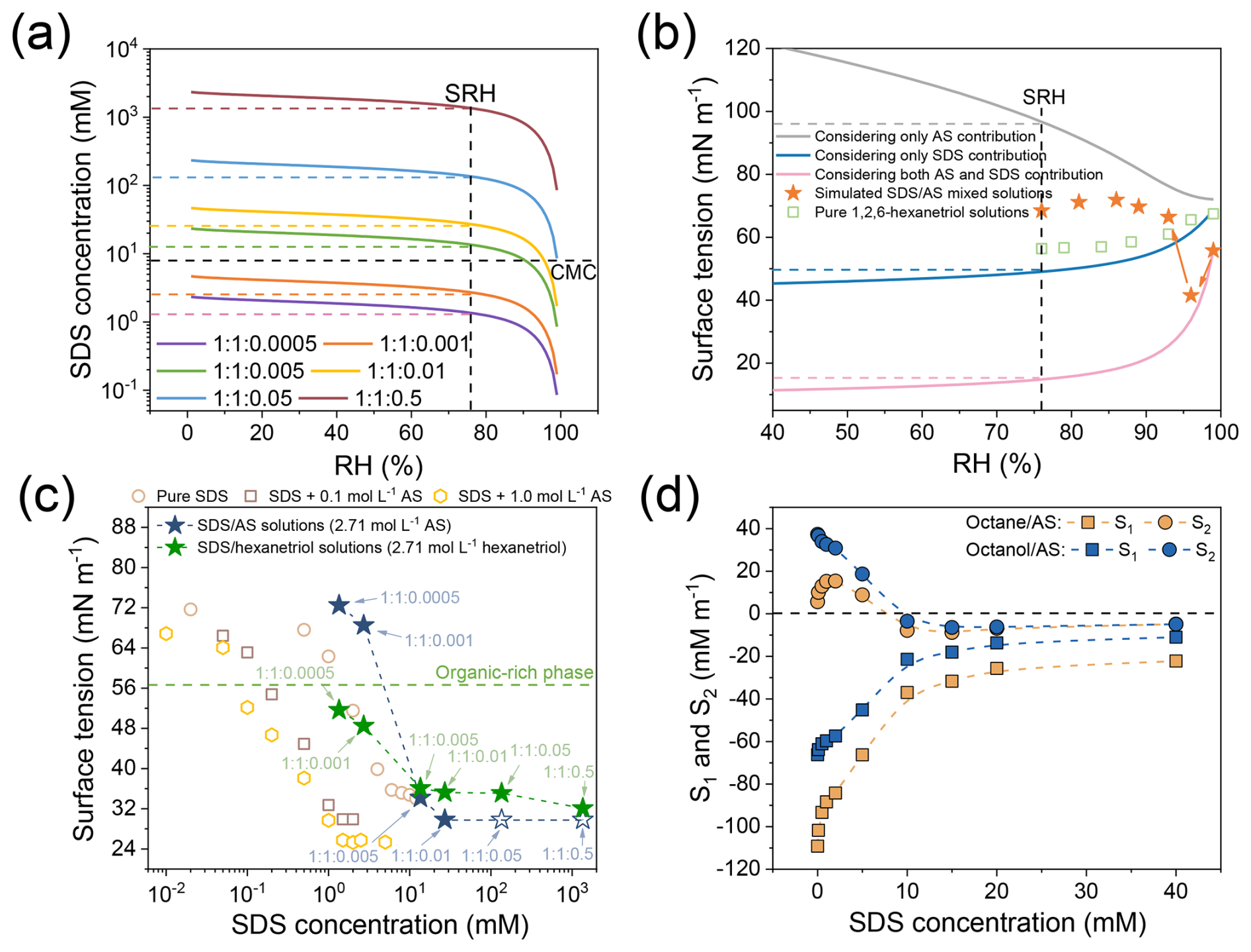 Figure 3(a) Evolution of SDS concentrations with decreasing RH, as predicted by the EAIM model for OIR = 1 : 1 particles with varying initial SDS concentrations. (b) Surface tension of org : sulf : SDS = 1 : 1 : 0.001 aqueous droplets as RH decreases, with predictions considering only AS, only SDS, or both AS and SDS contributions shown as lines and measurements from simulated SDS/AS mixed solutions and pure 1,2,6-hexanetriol solutions represented as scatter points. (c) Surface tension measurements at varying SDS concentrations for SDS/AS and SDS/1,2,6-hexanetriol mixed solutions, with a fixed AS or 1,2,6-hexanetriol concentration of 2.71 mol L−1. Hollow pentacles indicate estimated approximate surface tension values, and the green dotted line corresponds to the surface tension of aqueous 1,2,6-hexanetriol solution at 2.71 mol L−1. (d) Calculated spreading coefficients (S1 and S2) as a function of SDS concentration for octane/AS and octanol/AS model systems.