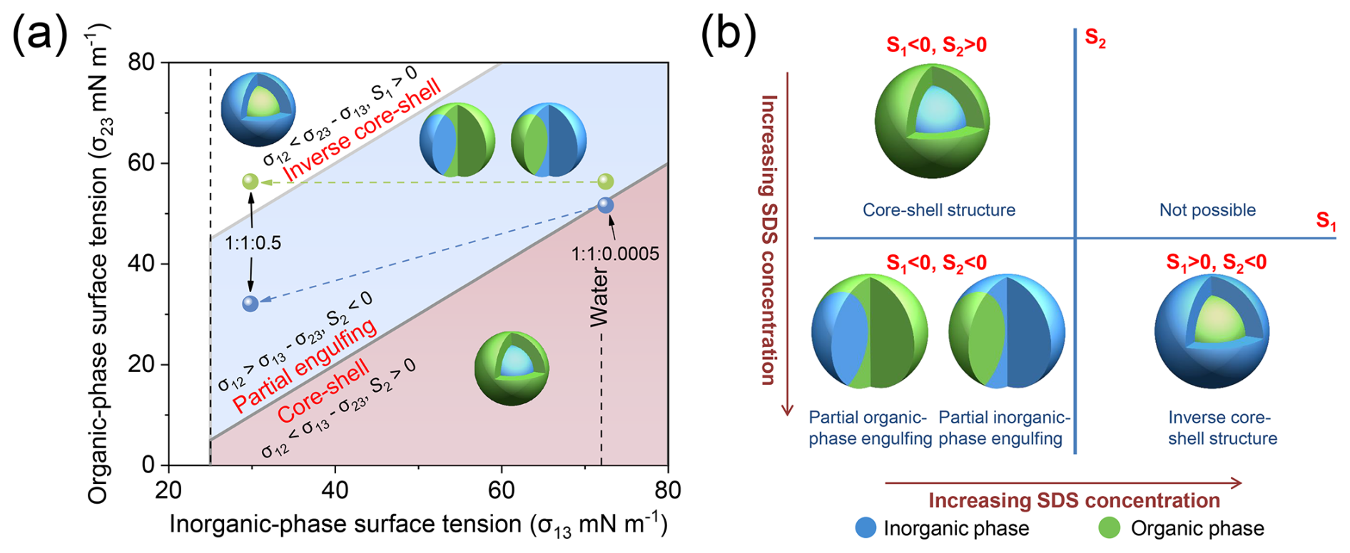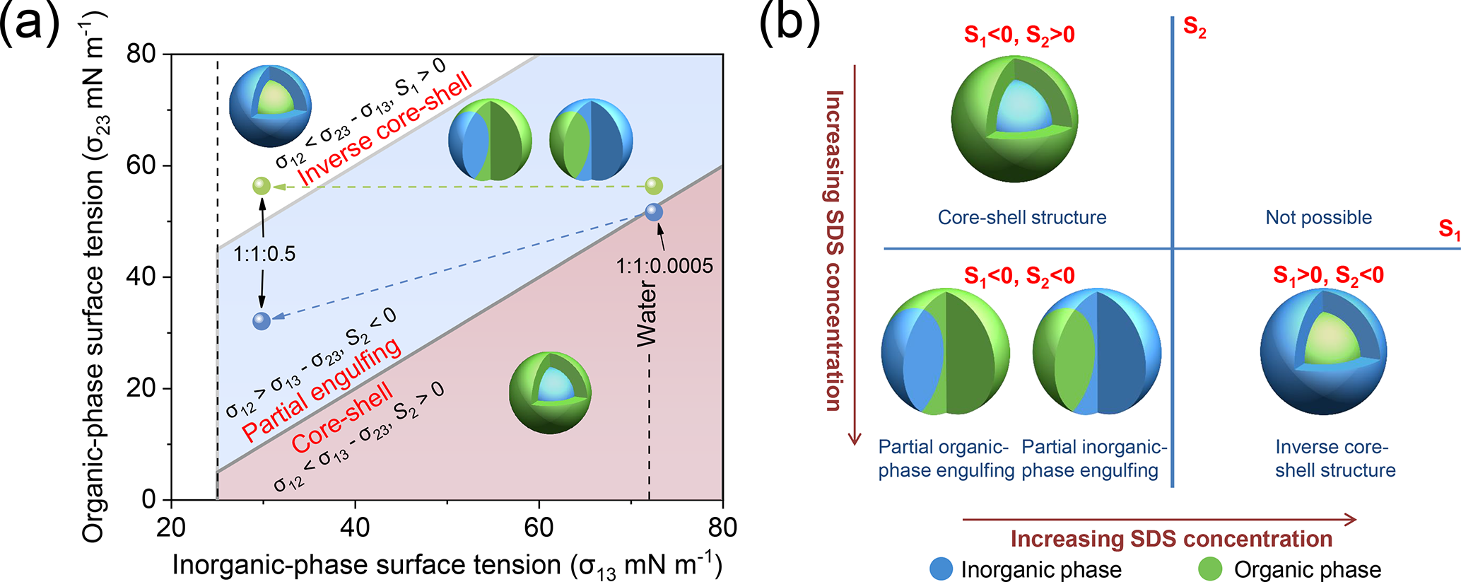 As indicated in Sect. 3.1, the SDS fraction in the 1 : 1 : 0.001 mixture reached the threshold concentration, coinciding with a morphological transition from core-shell to partial engulfing. In this case, we assume that the spreading coefficient S2 ≈ 0. Using the measured surface tensions of the simulated SDS/AS solution (σ13 = 68.49 mN m−1) and the SDS/1,2,6-hexanetriol solution (σ23 = 48.49 mN m−1) (see Fig. 3c), the organic-inorganic interfacial tension (σ12) is approximated to be 20 mN m−1. Notably, σ12 gradually decreased as the SDS fraction increased; hence, this conservative estimation will maximize the parameter space for the partial engulfing morphology. Based on this, we compare the difference in liquid-air surface tensions of biphasic systems (σ13−σ23 or σ23−σ13) with the organic-inorganic interfacial tension (σ12) to map out possible particle morphologies (Fig. 4a). Furthermore, two limiting cases for the organic-air surface tensions, as mentioned above, are considered. According to surface tension measurements from SDS/AS (inorganic-phase proxy) and SDS/1,2,6-hexanetriol (organic-phase proxy) solutions (shown in Fig. 3c), the corresponding blue spheres indicate the morphology evolution from core-shell to partial engulfing across the 1 : 1 : 0.0005 to 1 : 1 : 0.5 mixtures. However, if the surface tension of the organic-rich phase is assumed to be equal to that of a pure 1,2,6-hexanetriol solution at 2.71 mol L−1, the green spheres suggest a final inverse core-shell morphology in the 1 : 1 : 0.5 mixture, which better aligns with microscopic observations. This scenario supports the preferential partitioning of SDS molecules into the aqueous inorganic phase rather than the organic-rich phase.