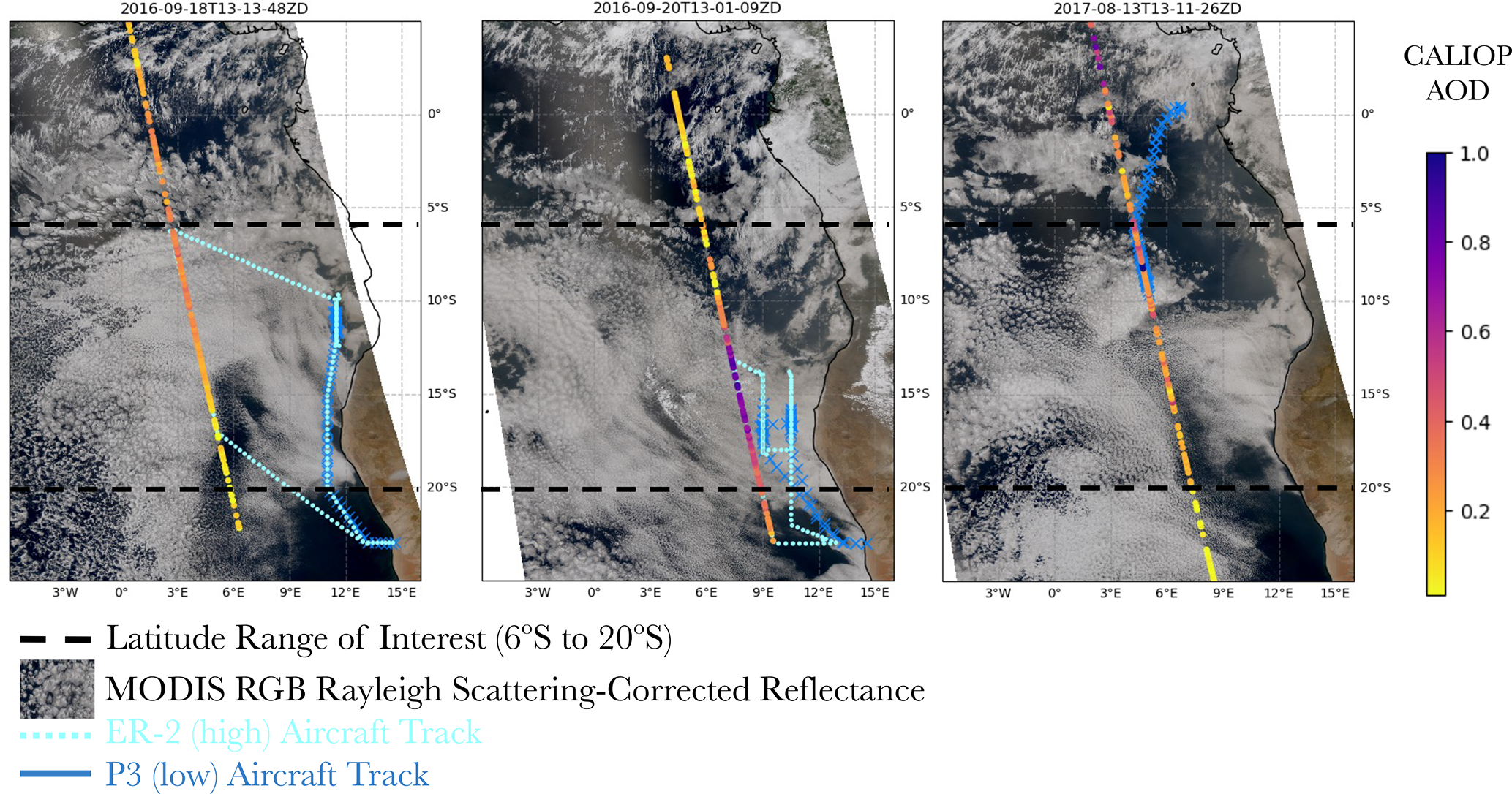 Figure 2Three case studies during ORACLES offshore from Namibia, southern Africa, on 18 September 2016, 20 September 2016, and 13 August 2017. The color bar shows AOD across the CALIOP/ CALIPSO flight tracks. The AOD is described under version 2 in Table A3 of the Appendix. MODIS RGB Rayleigh-scattering-corrected reflectance is in the background, together with ER-2 and P3 flight tracks in light and dark blue. 18 September 2016 and 20 September 2016 show satisfying co-location with the ER-2 aircraft. 13 August 2017 shows satisfying co-location with the P3 aircraft.