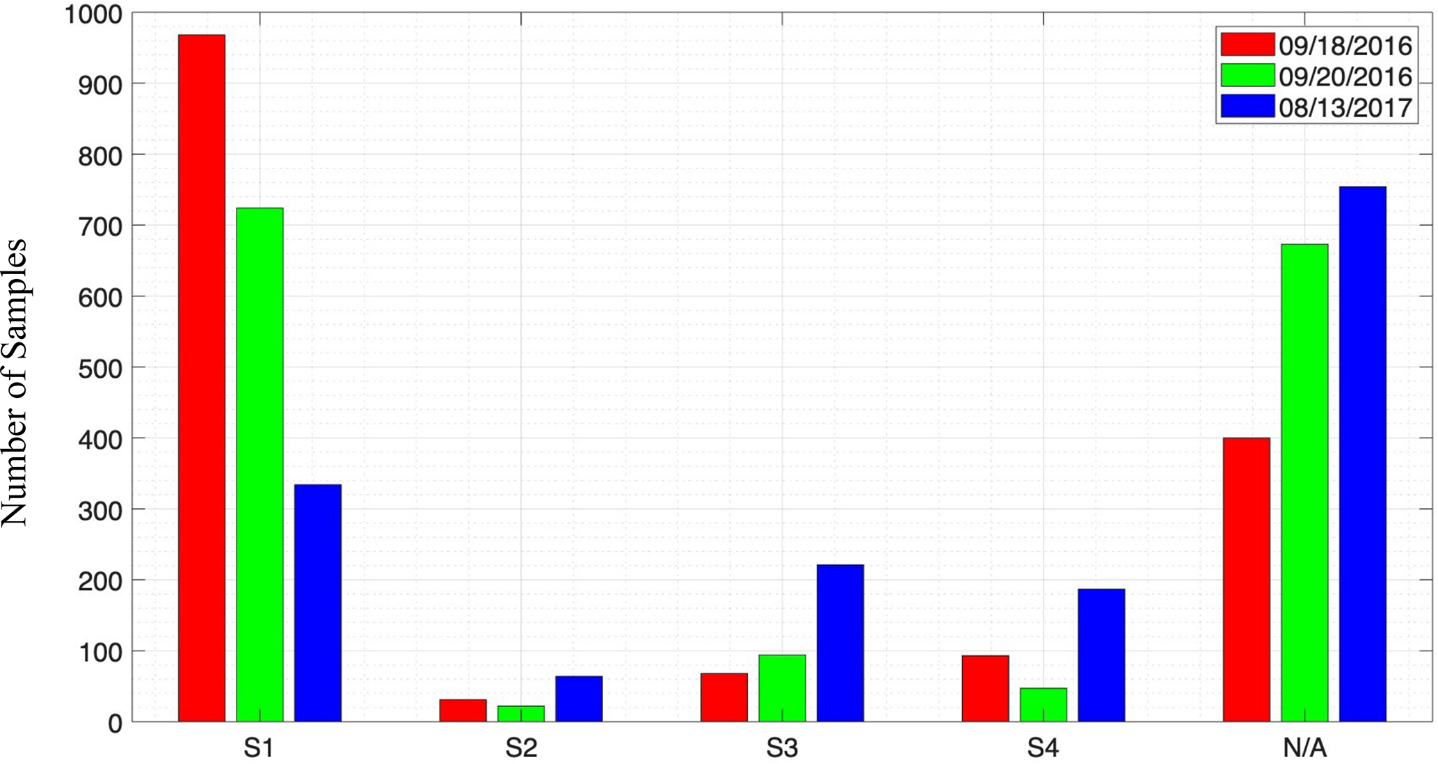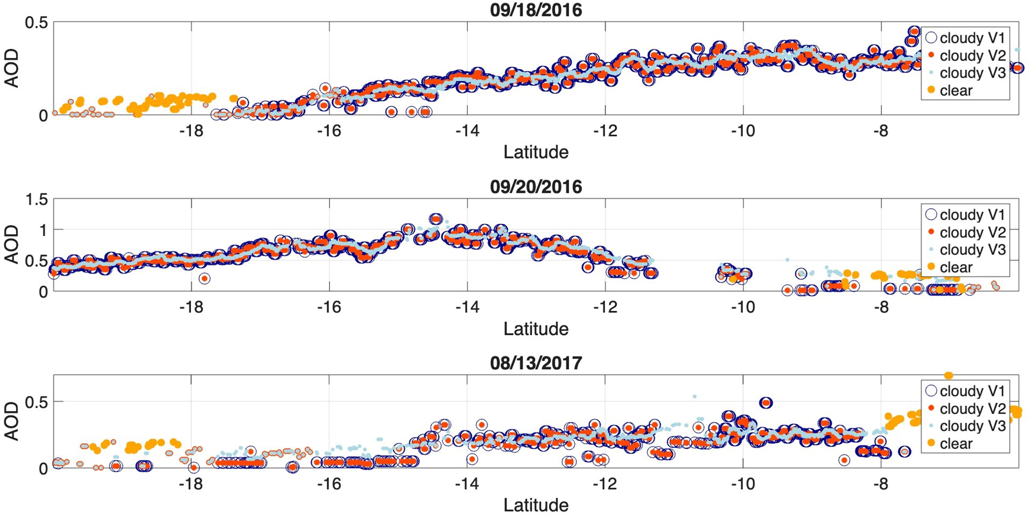 Figure 3 illustrates the number of S1, S2, S3, and S4 scenarios along the tracks on all 3 days of Fig. 2 when focusing between 6 and 20° S in latitude (see dashed horizontal black line in Fig. 2). We note a dominance of aerosol above thick clouds (S1); followed by unassigned (N/A) cases; and, lastly, non-cloudy sky (S4) and aerosol above and below thick, thin, and/or broken clouds (S2 and S3).