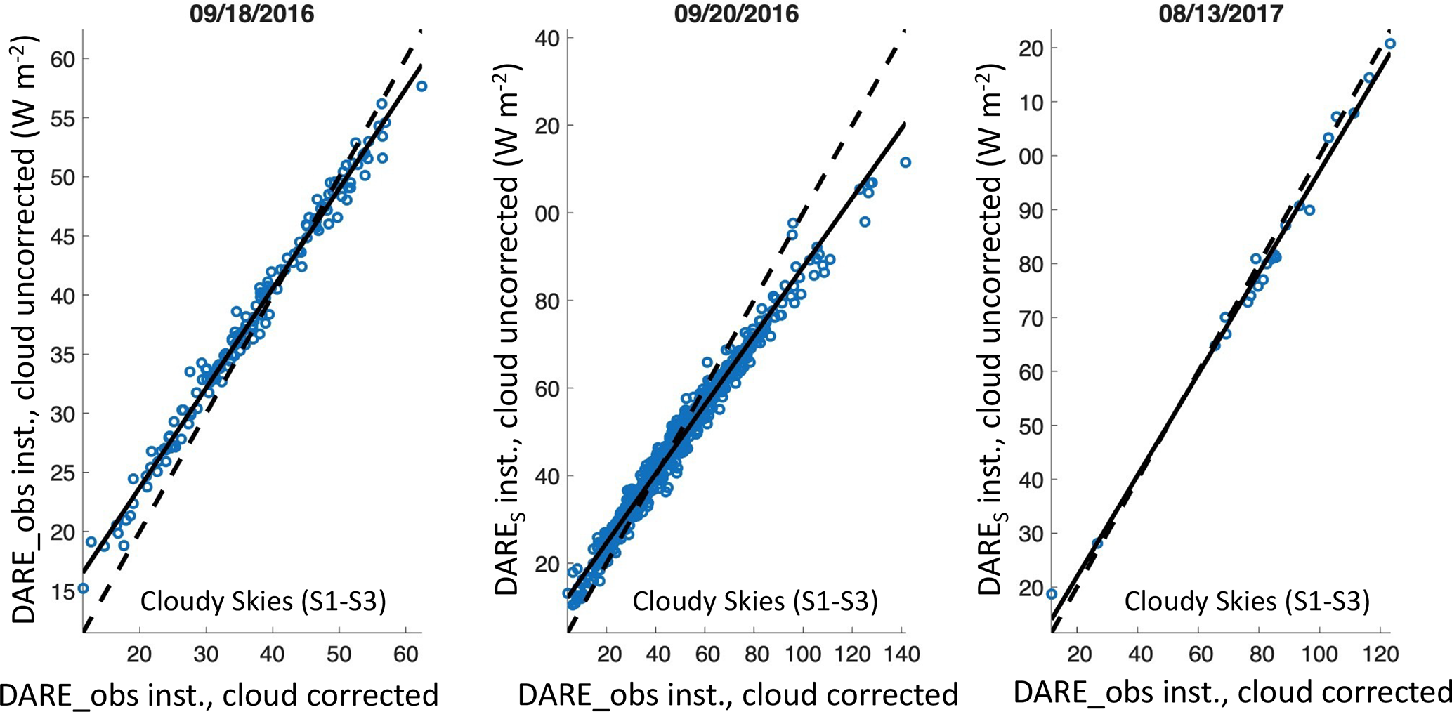 When clouds are present in the atmosphere, DARE_obs of aerosol above clouds (i.e., DAREcloudy for S1, S2, and S3 combined) is the subtraction of upward fluxes for clouds without aerosols and for clouds with aerosols above them. If we have N1 × S1, N2 × S2, and N3 × S3 cases along track, where NX represents the number of cases occurring for scenario SX, then we compute DAREcloudy as follows: