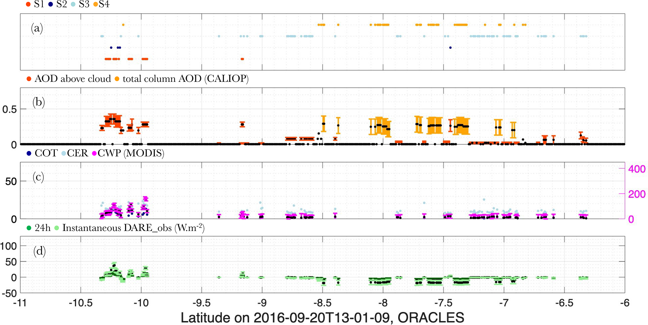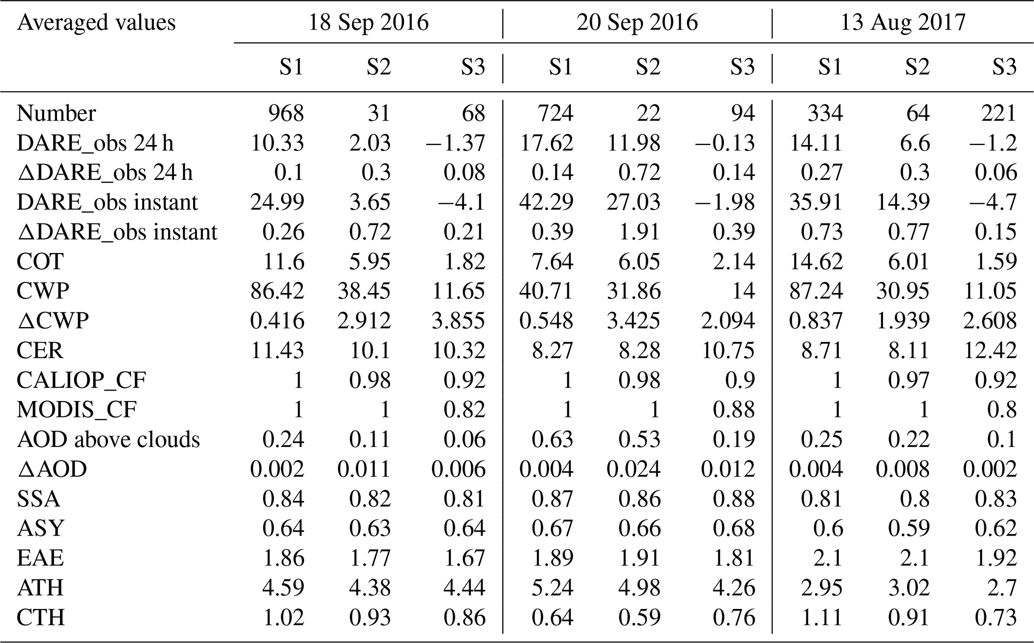 Table A3 in the Appendix describes which aerosol (derived from CALIOP and/or MERRA) and cloud parameters (derived from MODIS) were used and how these parameters were filtered to compute DARE_obs in the case of S1, S2, S3, and S4.