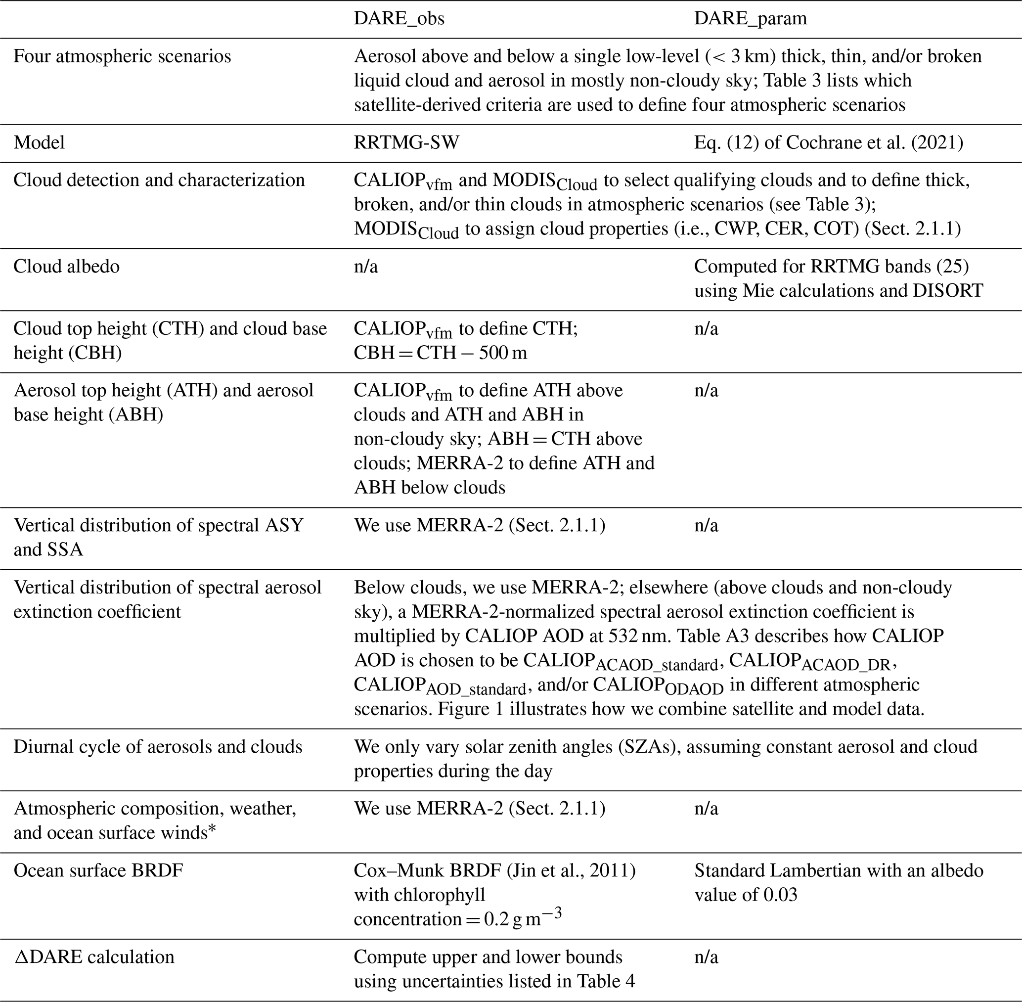 Table 2Two different DARE calculations (i.e., semi-observational DARE_obs described in Sect. 2.1 and parameterized DARE_param described in Sect. 2.2) in our study and their respective inputs. RRTMG-SW stands for Shortwave Rapid Radiative Transfer Model. See Table 1 for a description of CALIOPACAOD_standard, CALIOPACAOD_DR, CALIOPAOD_standard, CALIOPODAOD, CALIOPvfm, MODISCloud, and MERRA-2. n/a: not applicable.