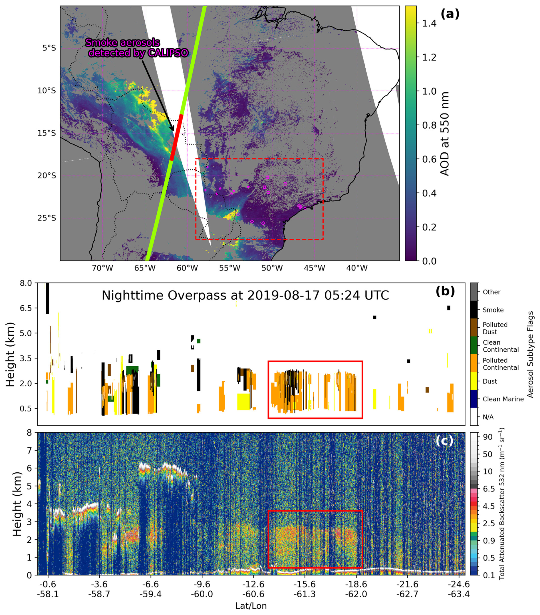 Figure 2 depicts the AOD550 map from MODIS Aqua on 17 August 2019, between 17:00 and 18:00 UTC and the profile of aerosol subtypes and of total attenuation backscatter signal from CALIPSO at 532 nm on the same day, between 05:42 and 05:49 UTC. Note, over South America, between 14–18° S and 61–62° W, there is a layer with the bottom at about 1.5 km and the top at 3 km, whose total attenuated backscatter values varied from 1.5 to 5 . This layer was identified as the subtype polluted continental/smoke with elevated smoke by the CALIPSO retrieval algorithm.