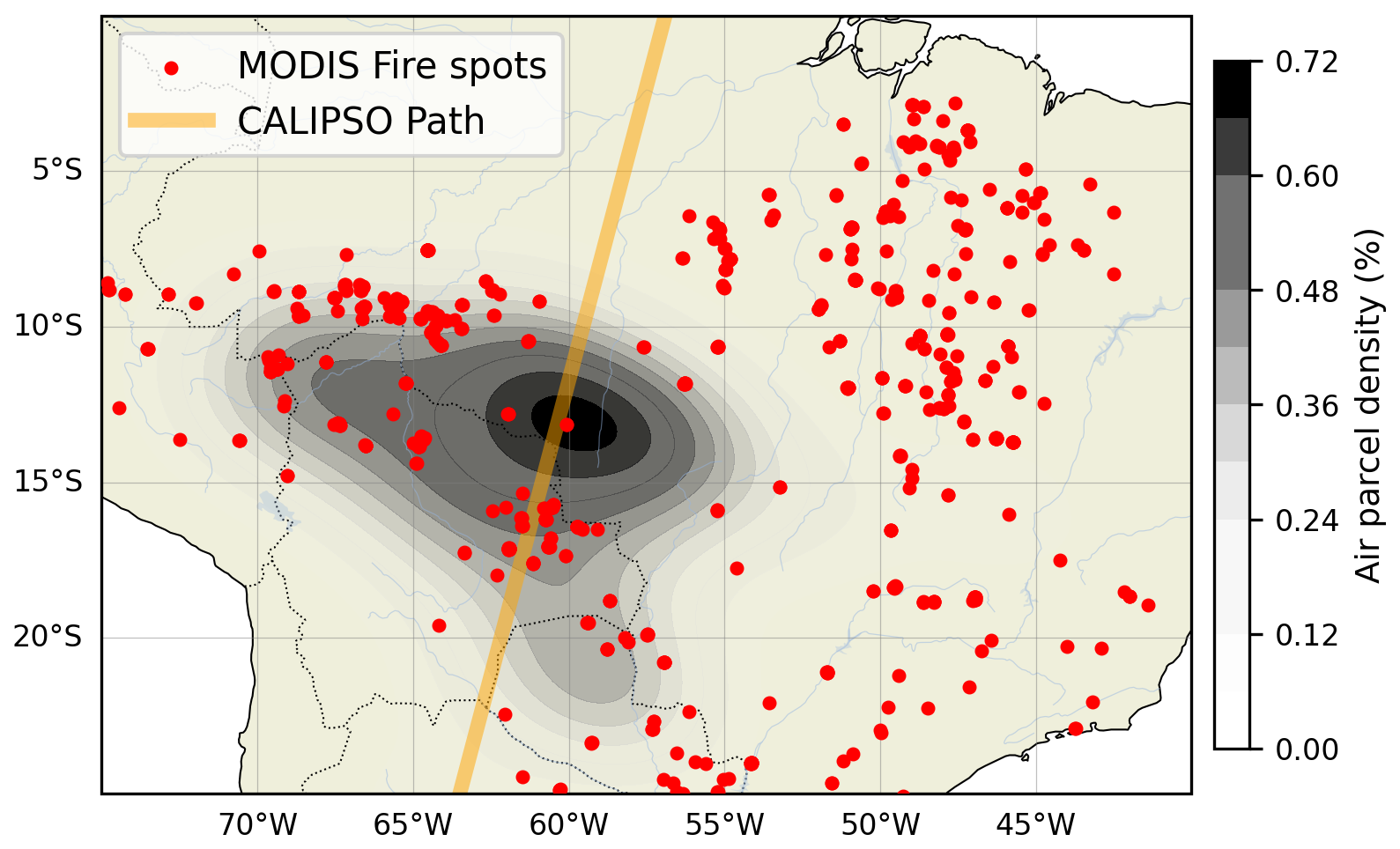 Figure 3 shows the area density of the origin of air parcels at 06:00 UTC on 17 August, which arrived at MASP on 19 August, and the fire spots and the CALIPSO satellite overpass track on 17 August. The trajectories of air mass originated around the border of Brazil and Bolivia, where a high number of fire spots were detected. Note that the aerosol layer observed by the CALIPSO (a.s.l) overpass crossed this region characterized by high density of air parcels and high fire spot number.