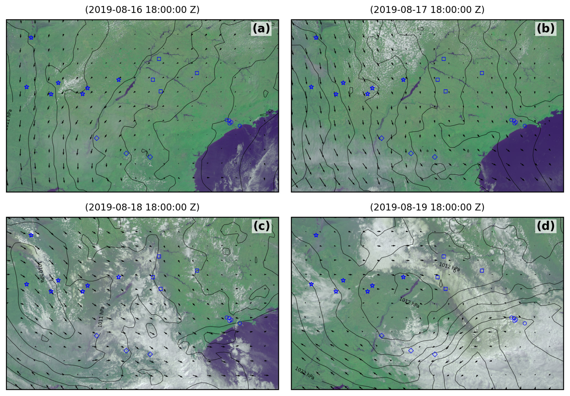 Figure 5Sequence of RGB satellite maps in natural colour using channels 2 (0.64 µm), 3 (0.86 µm) and 1 (0.47 µm) from GOES-16, allowing observation of cloud cover and the smoke plume. The maps also display wind components at 850 hPa (arrows) and mean sea level pressure isobars (lines) from ERA5 Reanalysis around 18:00 UTC (15:00 LT), for 16 August (a), 17 August (b), 18 August (c) and 19 August (d). The selected region is the same as in Fig. 1 and includes the stations, shown as markers.