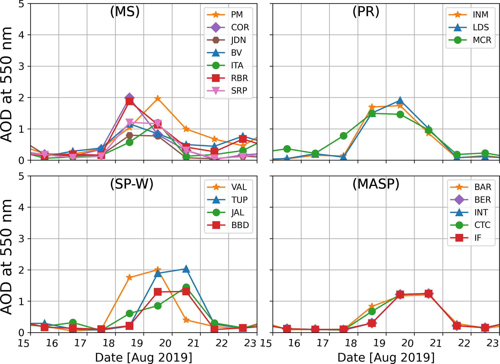 Daily time series of the maximum AOD at 550 nm from MODIS and MERRA-2 are shown in Fig. 6, with MERRA-2 AOD included only when the corresponding MODIS data were unavailable within a maximum distance of 0.4°. AOD increase was first observed at stations near the wildfires' source (MS), followed by PR state, around 18 August and 1 d later at stations in the eastward regions (SP-W and MASP). Note that maximum AOD values, exceeding 1.1, at MASP were estimated by MERRA-2 with bias correction on 18, 19 and 20 August. A particularly significant event occurred on 19 August at MASP, marked by strong darkness due to the combination of smoke and clouds.