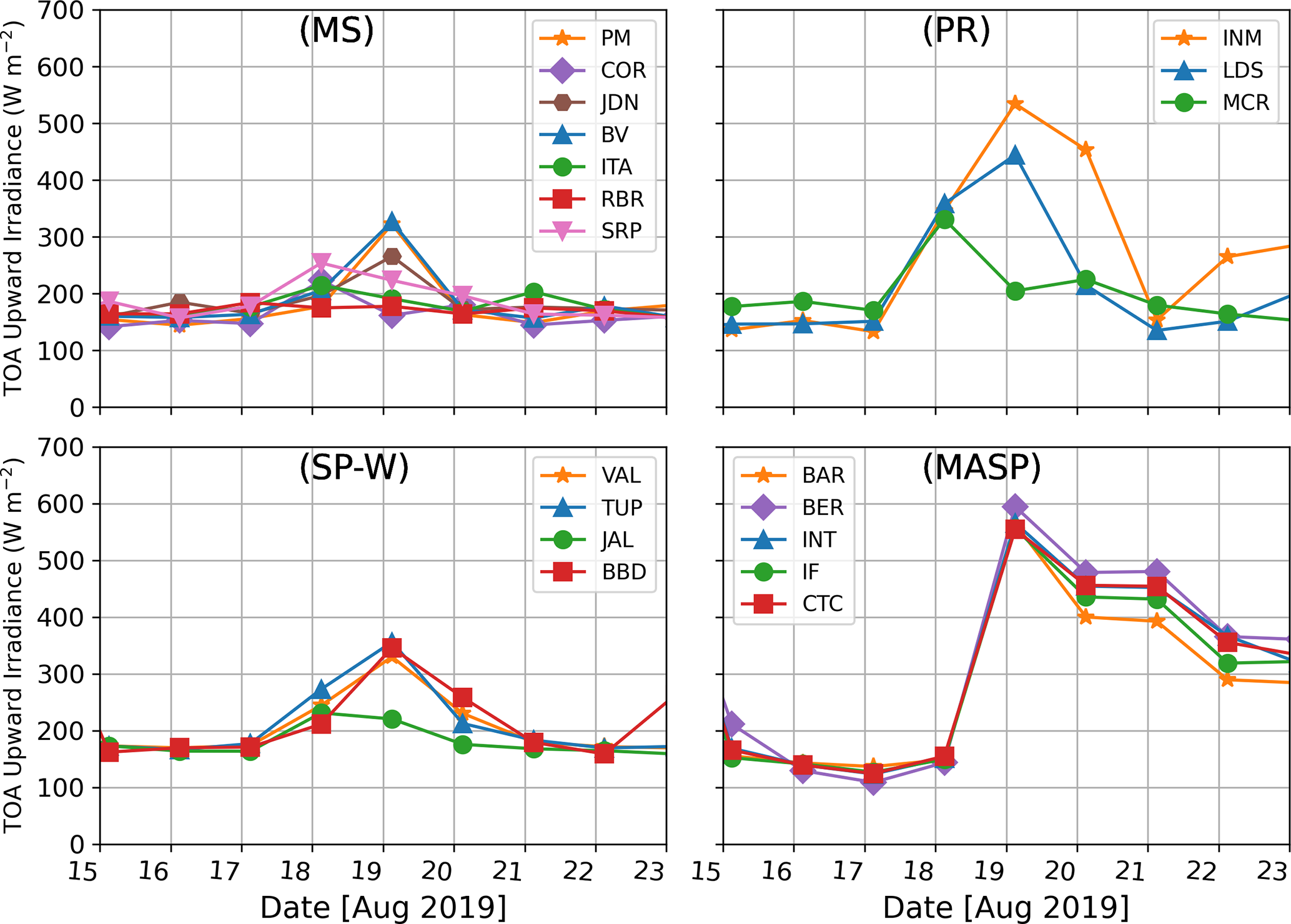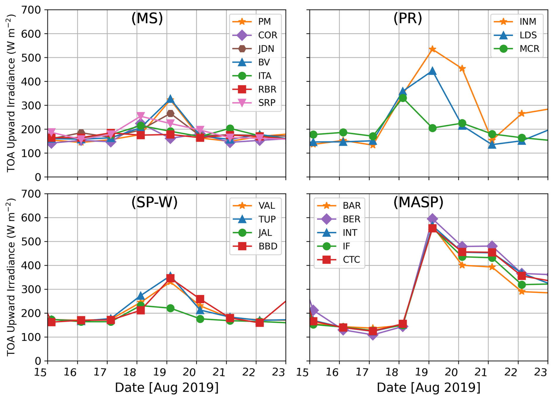Figure 7 shows all-sky values of upward irradiance at TOA at 13:00 and 18:00 UTC from CERES on board Terra and Aqua satellites, respectively. On 18 August, irradiance increased over the MS region, coinciding with higher AOD at 550 nm, and exceeded 250 W m−2 over station SRP, in the MS state. In other regions, the increase in irradiance was attributed to the combined effects of clouds and smoke. The SP-W region showed increased upward shortwave irradiance at the TOA between 18 and 19 August. The highest TOA irradiance was observed over MASP on 19 August, reaching above 500 W m−2, an increase in 350 W m−2 compared to previous days.