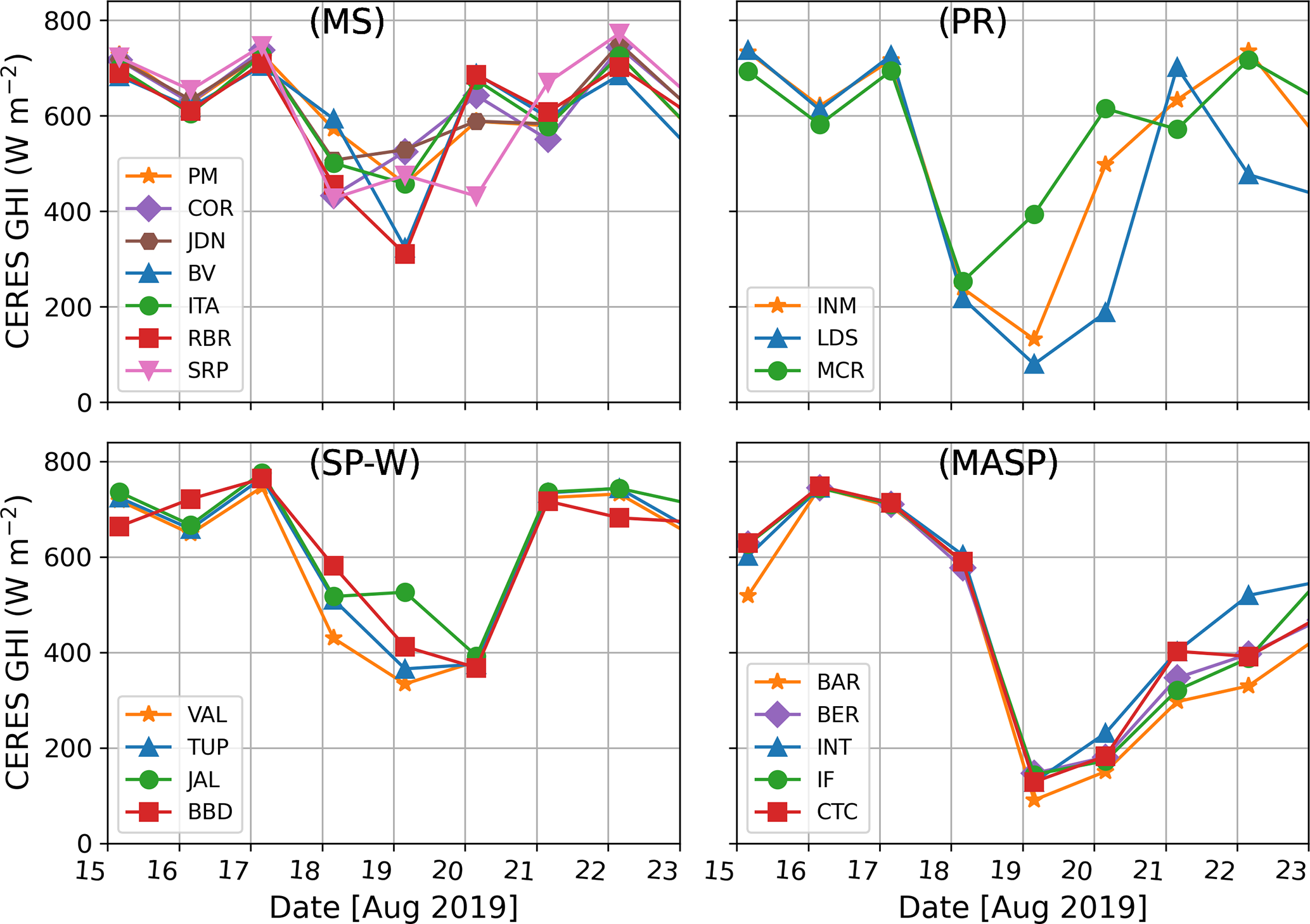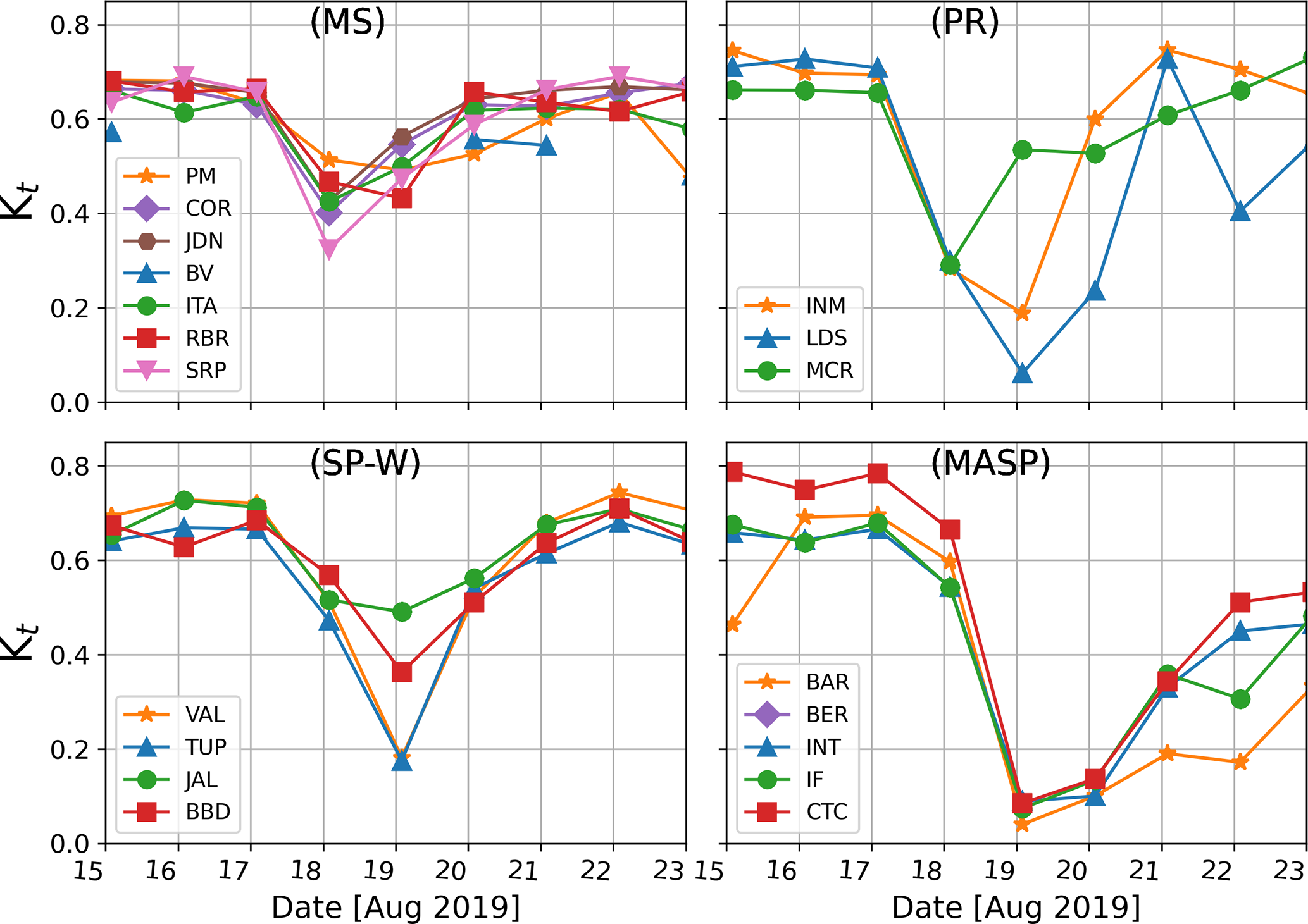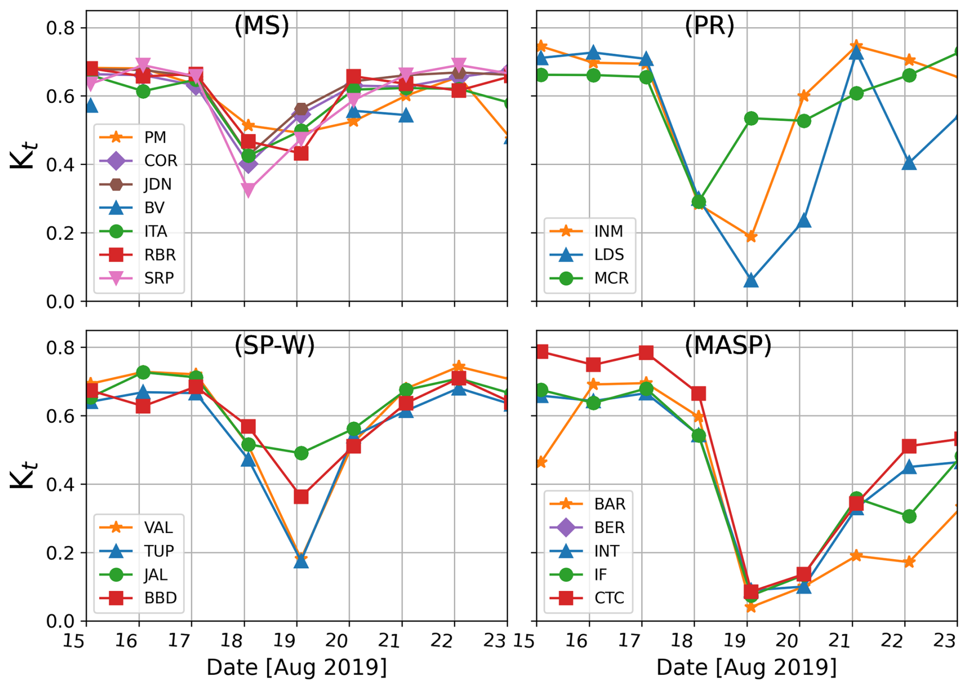 In the MASP, on 19 August, all stations agree with daily GHI dropped from 600 W m−2 on the previous day to around 100 W m−2 (Fig. 8), while Kt decreased from 0.6 to near 0.1 (Fig. 9). The daily Kt values near of 0.1 in MASP fall below the first percentile of the distribution from the past 2 years of all-sky observations in the region, indicating an extreme reduction in surface downward shortwave irradiance.
