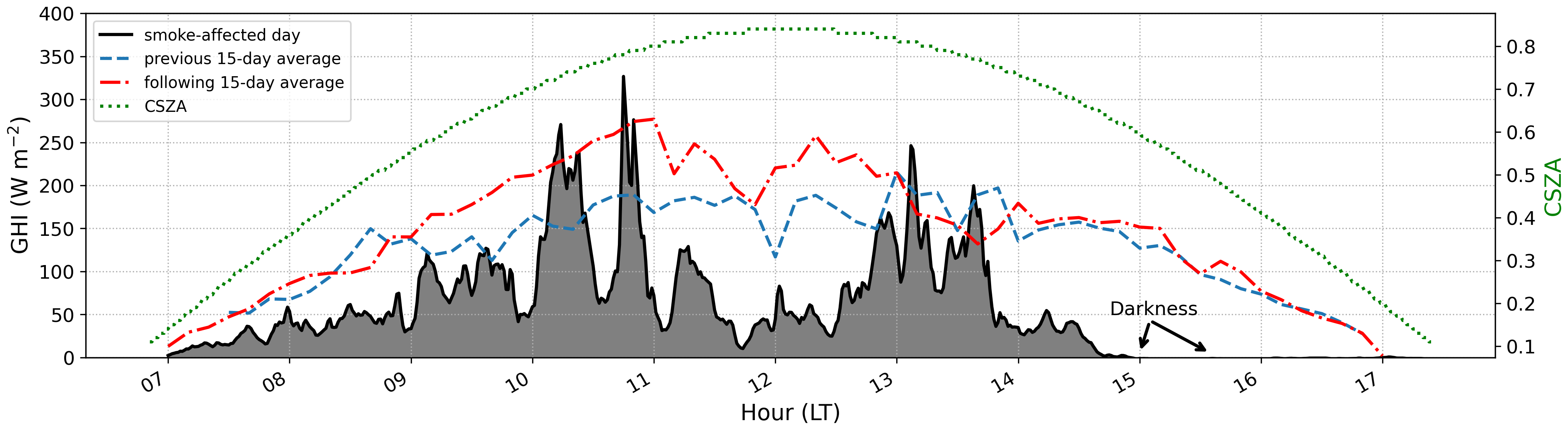 Figure 10Downward solar irradiance at the surface (GHI) during the smoke-affected day (19 August 2019) and average of 15 d before and after for all-sky conditions. In addition, the diurnal cycle of the cosine of the solar zenith angle (CSZA) for the smoke-affected day is shown.