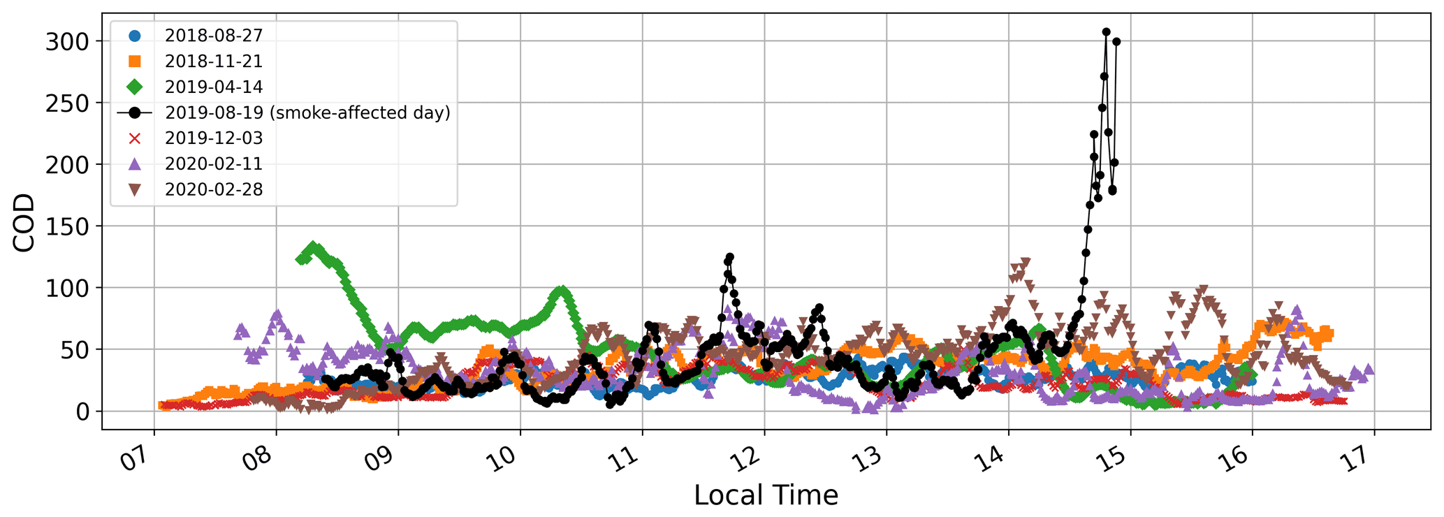 Figure 11Cloud optical depth (COD) retrieved from CNR4 measurements for the smoke-affected day (19 August 2019) and 6 other overcast days found for the period of 2018–2020.