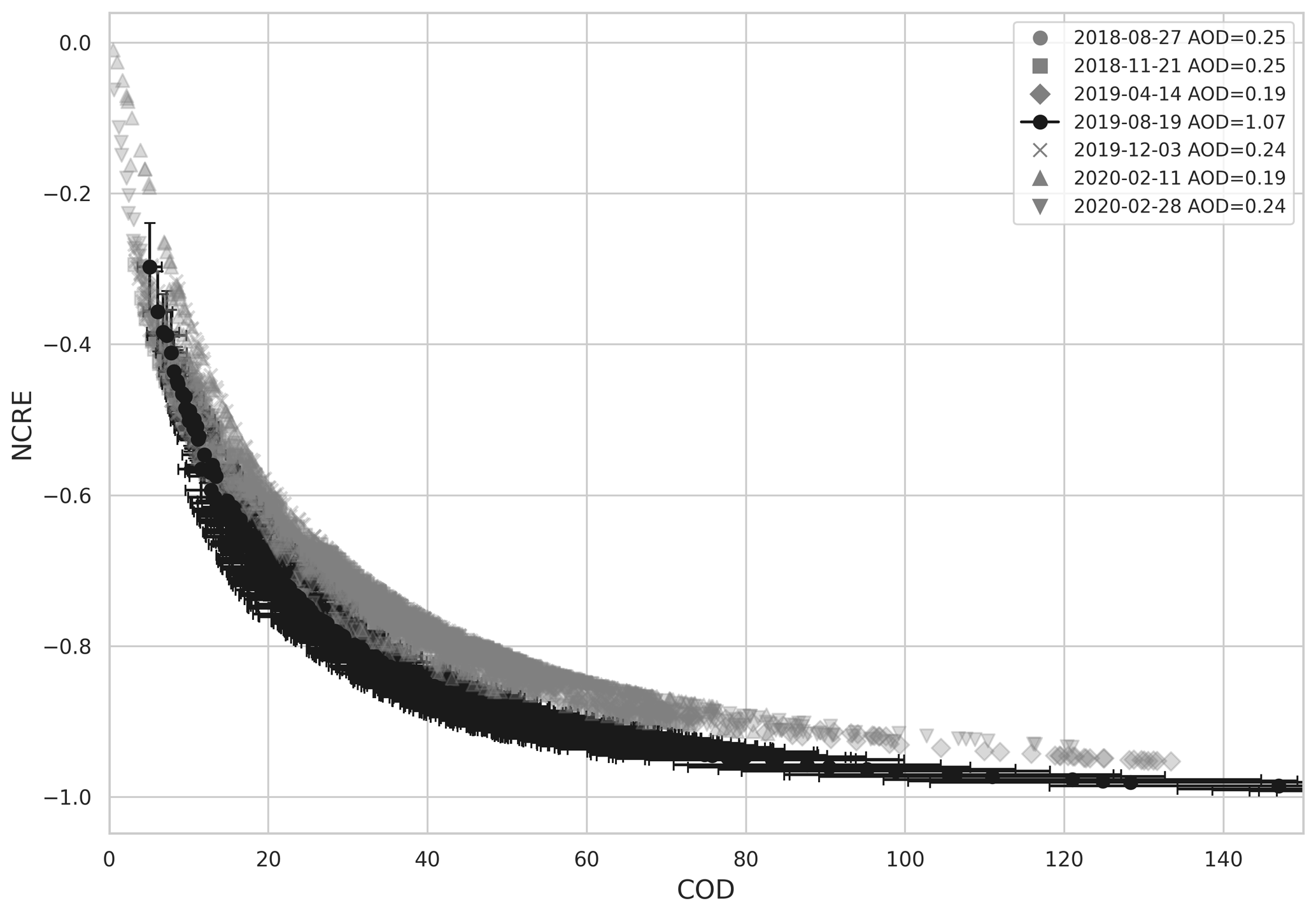 Figure 12Normalized cloud radiative effect (NCRE) versus cloud optical depth (COD) for the smoke-affected day (“19 August 2019”) and 6 other overcast days. Uncertainties associated with the estimation of each variable are also shown as vertical and horizontal bars.