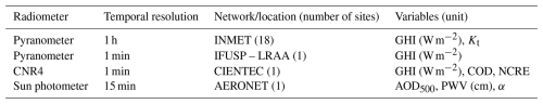 Table 1 lists the instruments, the temporal resolution of measurements, the network names or locations of each radiometer and the variables employed from each one. We analysed global horizontal irradiance (GHI) measurements from 18 pyranometers operated by the Instituto Nacional de Meteorologia (INMET). Additionally, GHI measurements were obtained from two instruments maintained by the Laboratório de Radiação e Aerossóis Atmosféricos (LRAA) from the Instituto de Astronomia, Geofísica e Ciências Atmosféricas (IAG): CNR4 Net Radiometer located at the Parque de Ciência e Tecnologia of the University of São Paulo (CIENTEC) and a pyranometer located on the roof of the Pelletron building at the Instituto de Física da Universidade de São Paulo (IFUSP). From the GHI, we computed the diurnal clearness index (Kt), defined as the ratio of diurnal GHI at the surface to the equivalent value at the top of the atmosphere (TOA). Furthermore, the normalized cloud radiative effect (NCRE) is estimated using GHI along with radiative transfer simulations (Sect. 2.4).