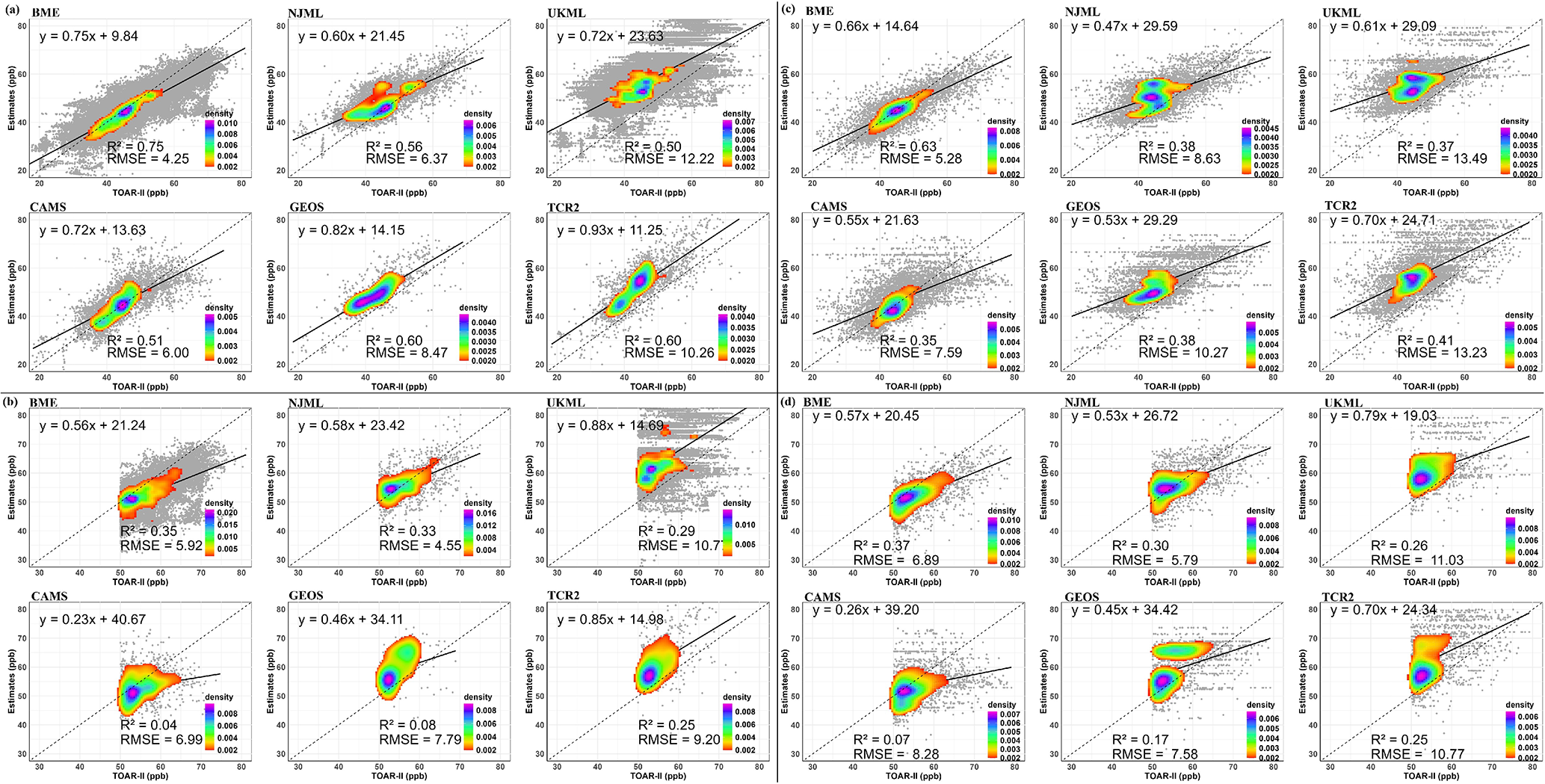 Figure 1Performance evaluations of six datasets with TOAR-II observations in 2016 for OSDMA8. The observation-prediction evaluations are presented with densities estimated by a Gaussian kernel function. The coefficient of determination (R2) and root mean squared error (RMSE) are shown for four scenarios: (a) a grid-to-grid evaluation at the native resolution of each dataset using re-gridded TOAR-II observations, (b) a grid-to-grid evaluation, same as panel (a), but only for grid cells with observations above 50 ppb, (c) a grid-to-point evaluation using all TOAR-II sites, (d) a grid-to-point evaluation, same as panel (c), but only for sites with observations above 50 ppb. The dashed line marks where TOAR-II observations equal estimates (y=x line), and the solid black line represents the best-fit line. Performance evaluations for each year are shown in Figs. S7 and S8.