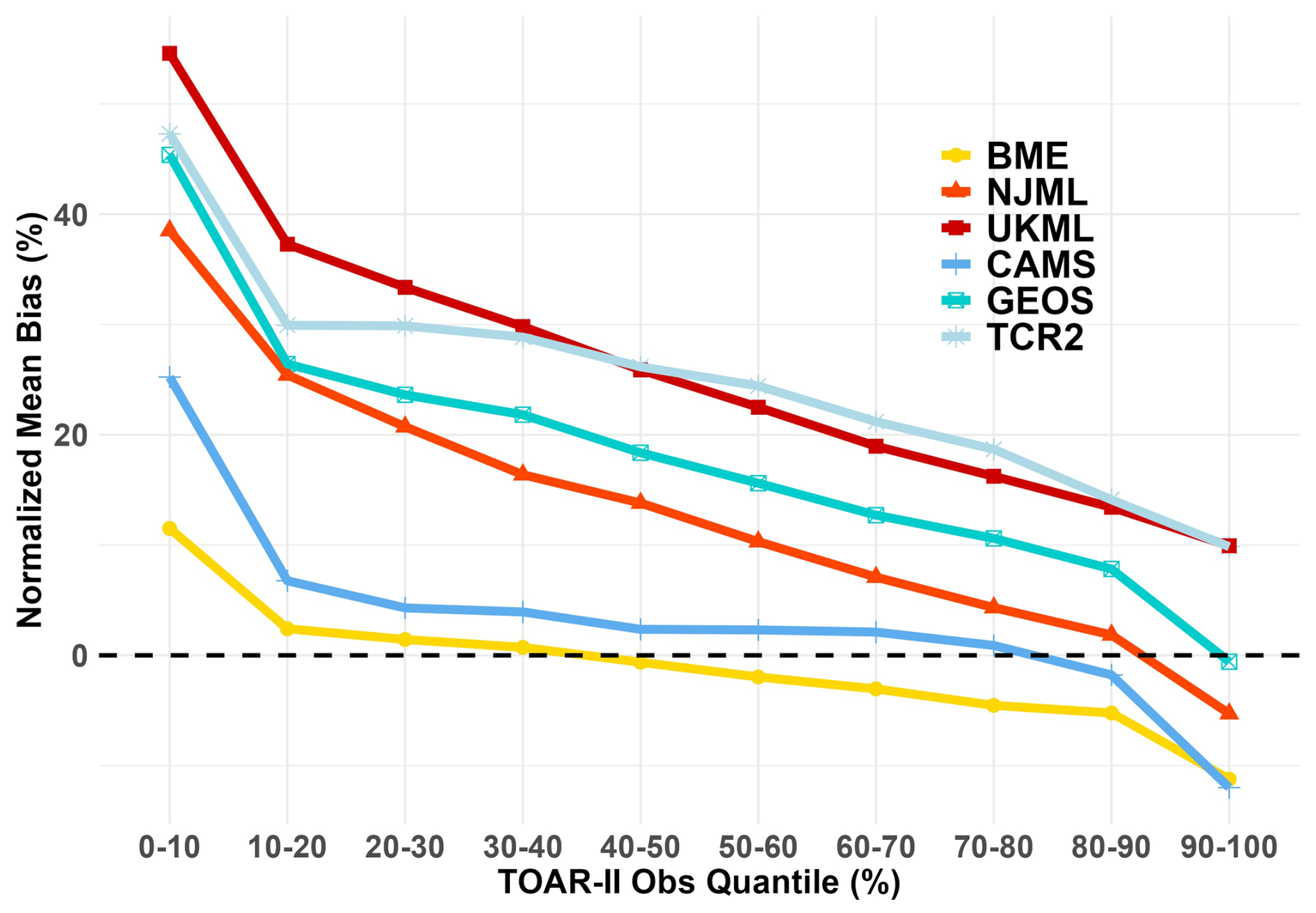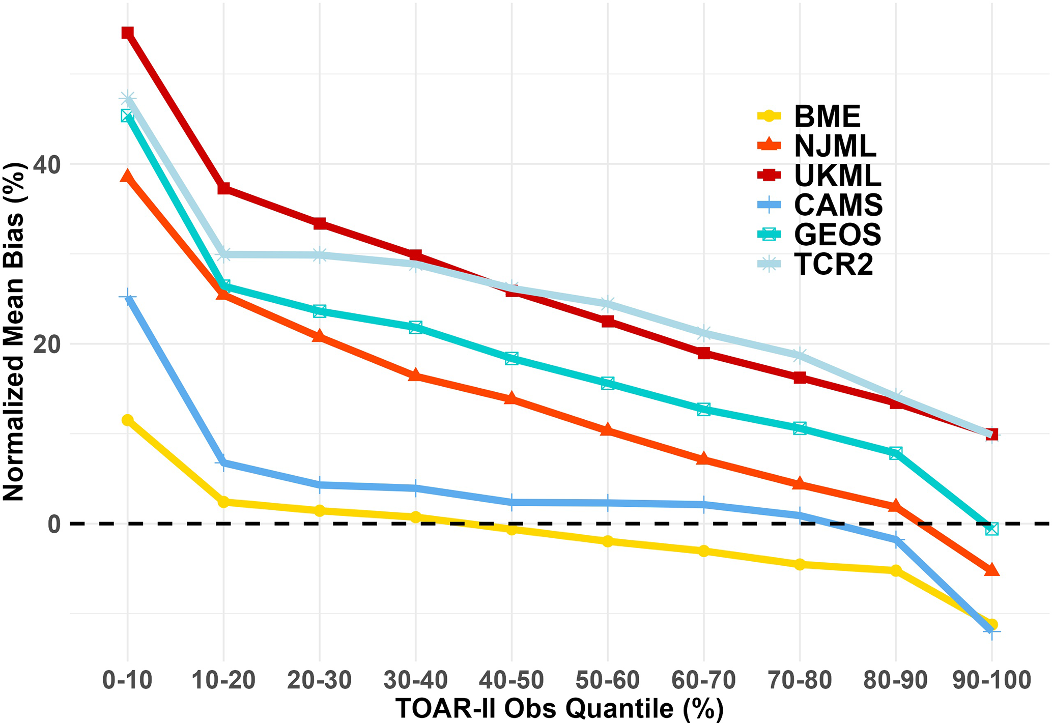 Figure 1b and d focuses only on TOAR-II grid cells or sites with OSDMA8 value above 50 ppb, showing that R2 is reduced compared to the comparison of all ozone measurements (Fig. 1a and c) for all six datasets, suggesting overall weaker agreement between modeled and observed ozone distributions at higher concentrations. All six datasets show decreasing performance from BME, NJML, and UKML to TCR-2, GEOS-Chem, and CAMS, with R2 of 0.35, 0.33, 0.29, 0.25, 0.08, and 0.04 for grid-to-grid; 0.37, 0.30, 0.26, 0.25, 0.17, and 0.07 for grid-to-point, respectively. However, the change of biases varies among datasets at higher concentrations. Specifically, overestimation is reduced in the UKML, NJML, GEOS-Chem, and TCR-2 datasets when observations exceed 50 ppb in both evaluation methods. Conversely, we observe increased underestimation in the BME and CAMS datasets at ozone levels above 50 ppb. This proportional bias is consistent with the linear regression slope, which is less than 1 for all six datasets in Fig. 1. Figure 2 shows the normalized mean bias for stratified concentration intervals in 2016, which provides insights into the average discrepancy between estimates and TOAR-II observations across ozone concentration ranges. All six datasets overestimate TOAR-II observations below the 40 % concentration interval. Only BME underestimates above the 40 % concentration level, CAMS underestimates above the 80 % concentration interval, and NJML underestimates above 90 % concentration interval, aligning with the density kernel presented in Fig. 1. BME demonstrates the smallest mean bias, particularly below the 50 % concentration level and CAMS shows the smallest mean bias in the 50 % to 90 % concentration interval. In the 90 % to 100 % concentration interval, NJML and GEOS-Chem have the smallest mean bias. In summary, BME and CAMS perform better overall in terms of normalized mean bias, with other models tending to overestimate ozone at almost all concentrations. Detailed plots of normalized mean bias for stratified concentration intervals for each year from 2006 to 2015 are shown in Fig. S5.