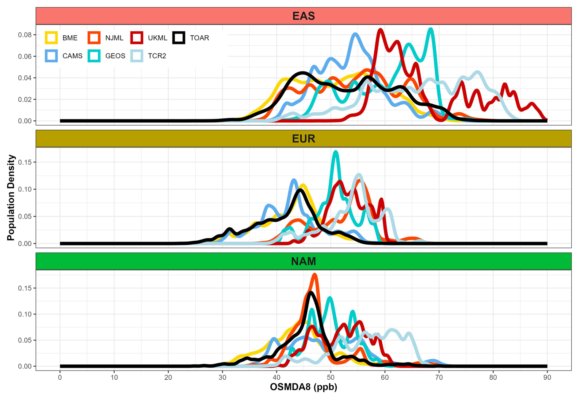 Figure 3Population-weighted exposure distributions for OSDMA8 in 2016 in three regions: East Asia (EAS), Europe (EUR), and North America (NAM) (regions defined in Table S7). Each panel compares the distribution derived from the TOAR-II observations (black line) with estimates from six datasets (colored lines), calculating the population-weighted kernel density estimate, only for grid cells where TOAR-II measurements exist.