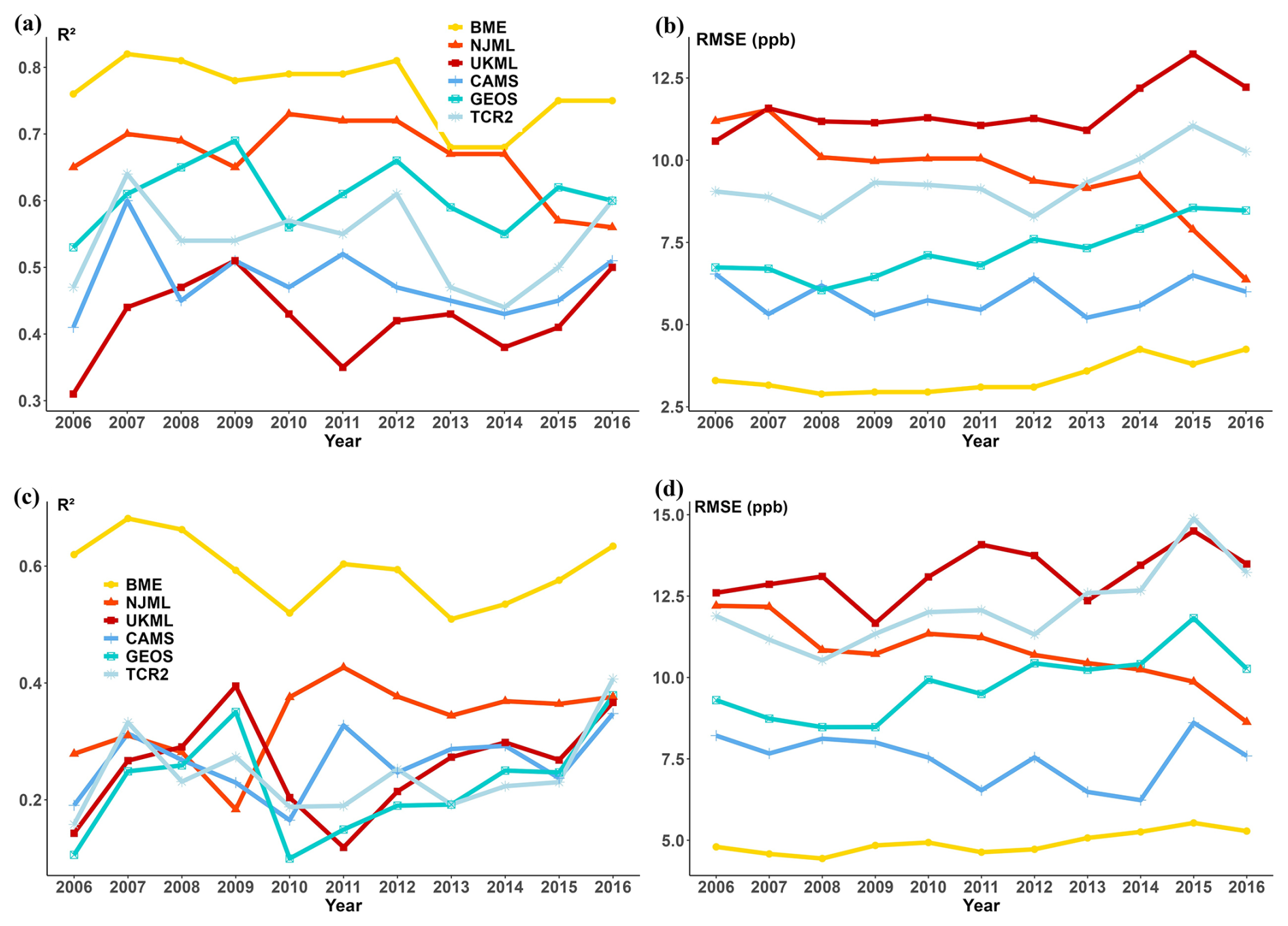 Figure 4 presents time series plots of R2 and RMSE from grid-to-grid and grid-to-point evaluations of each dataset against TOAR-II observations from 2006 to 2016. It is important to note that the years 2015 and 2016 include observations from China. In Fig. 4a and c BME consistently shows the largest R2, indicating its robust performance near the monitor locations due to the utilization of observational data as input and the effective exploitation of spatiotemporal autocorrelation among stations. Apart from BME, for both evaluation scenarios NJML outperforms other datasets in R2 from 2010 to 2014, and TCR-2 leads in 2007 and 2016. In grid-to-point evaluation, five datasets, excluding NJML, demonstrate a drop in R2 in 2010, and all datasets show an increase in R2 from 2015 to 2016. In grid-to-grid evaluation, GEOS-Chem shows an overall better performance in R2 than CAMS, TCR-2 and UKML. For both scenarios, BME maintains the lowest RMSE throughout the period, indicating the most accurate predictions. CAMS also performs well in terms of RMSE. From 2006 to 2013, GEOS-Chem consistently has lower RMSE than both TCR-2 and UKML. Meanwhile, NJML exhibits a decreasing RMSE from 2006 to 2016. The clear differences in time series of RMSE correspond with the yearly mean trends in Fig. 5. Datasets with lower ozone values, BME and CAMS, also exhibit lower RMSE, whereas those with higher estimates, specifically TCR-2 and UKML, have higher RMSE. From 2006 to 2016, the performance rankings derived from R2 values varied significantly between the two evaluation scenarios, whereas the RMSE based rankings were nearly consistent.