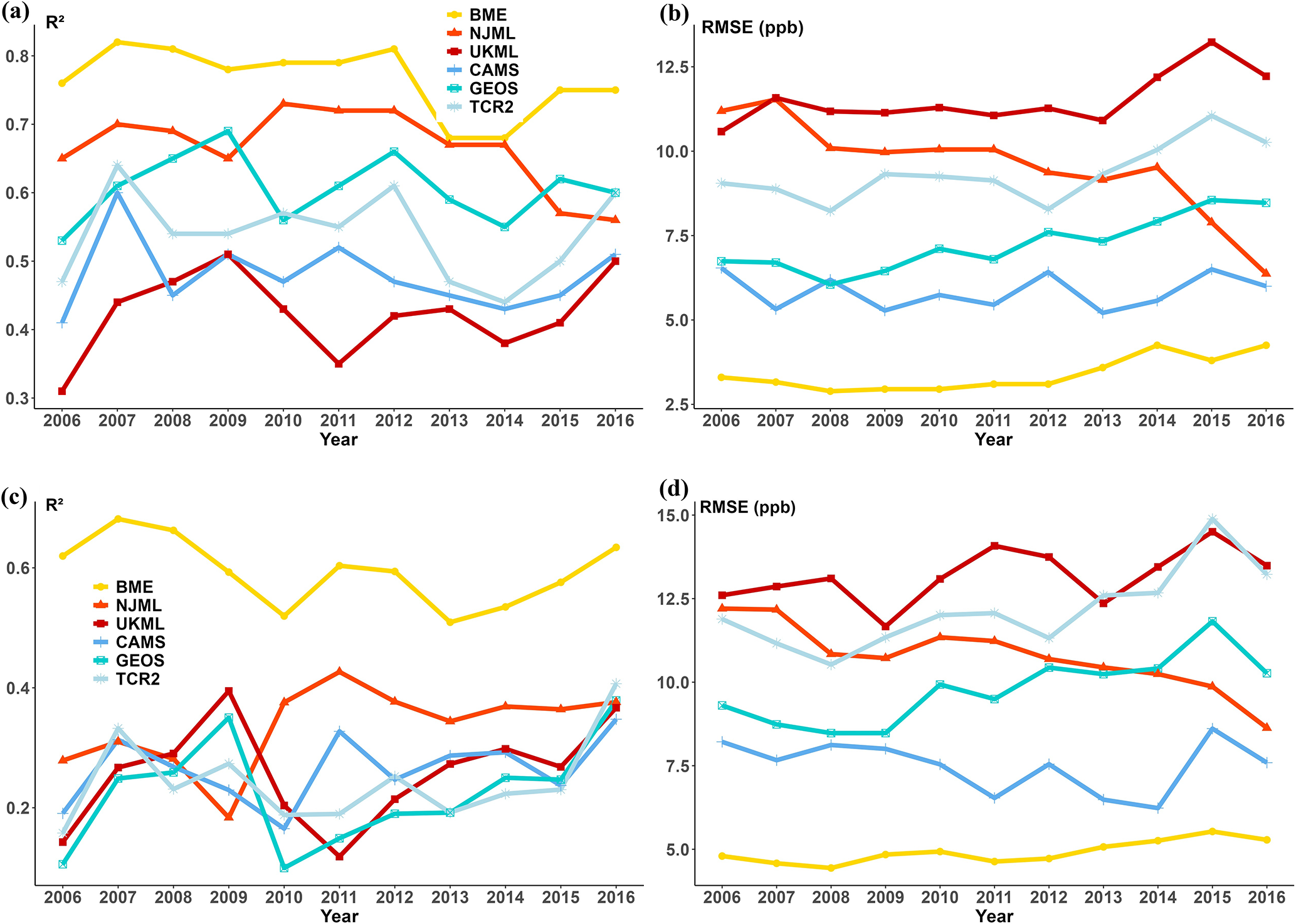 Figure 4(a) Time series of determination (R2) between each dataset and TOAR-II observations of OSDMA8 from 2006 to 2016 based on grid-to-grid evaluation at the native resolution of each dataset using re-gridded TOAR-II observations. (b) Time series of root mean squared error (RMSE) between each dataset and TOAR-II from 2006 to 2016 based on grid-to-grid evaluation. (c) Time series of determination (R2) between each dataset and TOAR-II observations of OSDMA8 from 2006 to 2016 based on grid-to-point evaluation using all TOAR-II sites. (d) Time series of root mean squared error (RMSE) between each dataset and TOAR-II from 2006 to 2016 based on grid-to-point evaluation.