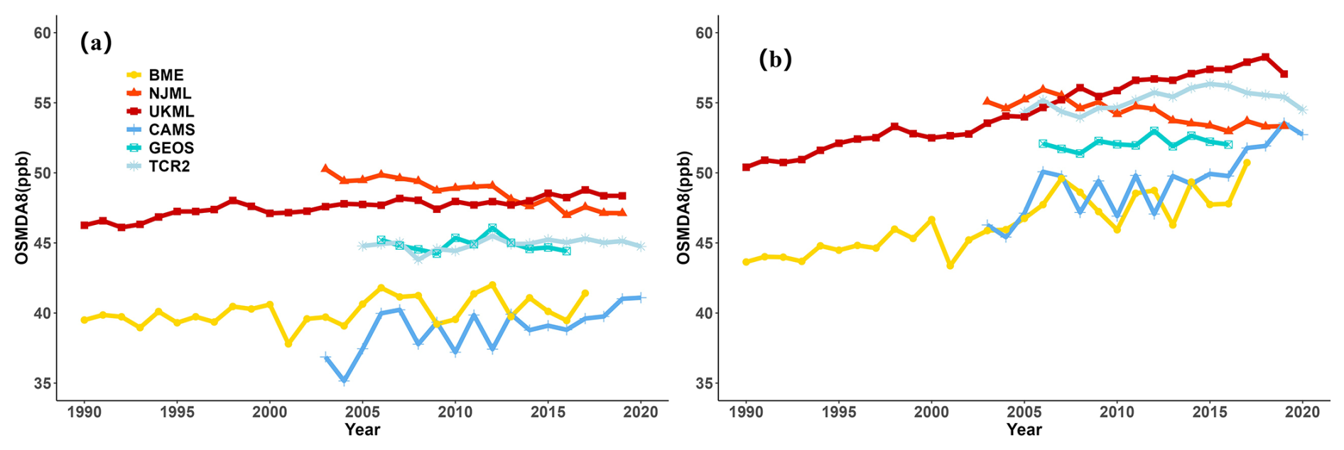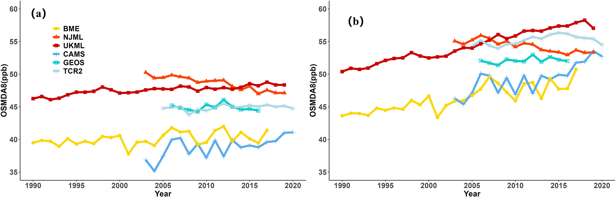Figure 5Yearly trends of ground-level ozone for six datasets, shown for (a) the area weighted global mean ozone over land, and (b) population weighted global mean ozone, where ozone is expressed as OSDMA8. Yearly trends for individual world regions are shown in Figs. S2 and S3. Mann-Kendall trend test for population weighted global mean over the full time series for each dataset: BME 0.688 ppb yr−1 trend with p-value < 0.0001, NJML −0.691 ppb yr−1 with p-value 0.0001, UKML 0.913 ppb yr−1 with p-value < 0.0001, CAMS 0.569 ppb yr−1 with p-value 0.0011, GEOS-Chem 0.164 ppb yr−1 with p-value 0.5334, TCR-2 0.4 ppb yr−1 with p-value 0.0343.