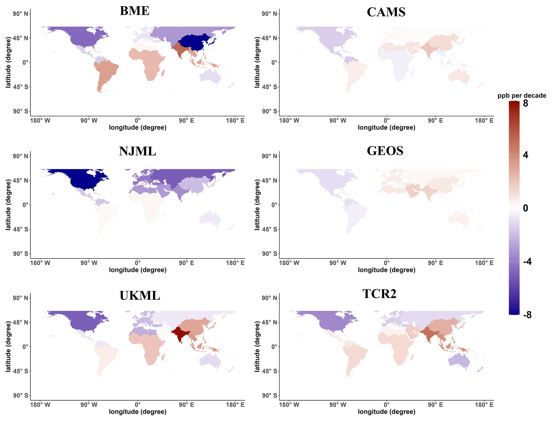 Both the area-weighted and population-weighted mean trends of global OSDMA8 reveal substantial differences among global ozone mapping datasets (Fig. 5). Notably, BME and CAMS have lower ozone values than other datasets, for both metrics, while UKML and NJML have higher ozone estimates, with differences between these datasets exceeding 5 ppb. The higher values in GEOS-Chem and TCR-2 may be attributed to the remaining high bias in the forecast models, which is commonly found in CTMs (Travis and Jacob, 2019). The population-weighted mean is higher than the area-weighted mean, by 5–10 ppb across all datasets, and for UKML and BME, the disparity between population-weighted and area-weighted ozone concentrations appears to widen over time. The faster increase in the population-weighted mean compared to the area-weighted mean appears to be driven by rising ozone levels in highly populated regions. In Table 3, focusing on 2006 to 2016, we find that NJML was the only dataset to exhibit a downward trend with very high certainty for both area- and population-weighted mean ozone concentrations. In contrast, TCR-2 and UKML only show increasing trends in population-weighted mean ozone during this period with very high certainty. However, while the BME dataset shows a negative slope for the area-weighted mean, this downward trend has only low certainty; for the population-weighted mean, there is no evidence of a decreasing trend. Figure 6 illustrates regional ozone changes per decade, weighted by population, across different regions in each dataset over 2006 to 2016. NJML, despite its overall decreasing trend in Table 3, does not uniformly show declines across all regions. The decrease in NJML is predominantly in North America, notably over 8 ppb per decade in the US and Canada, while Sub Saharan Africa and South America exhibit increases. BME and UKML, with the longest duration, both display decreasing trends in North America, and Europe, and increases in Southeast Asia and Middle East. Both datasets indicate greater decreases in North America than in Europe and more significant increases in the Middle East than in Southeast Asia. However, BME shows a downward trend in East Asia, while UKML exhibits the reverse. CAMS and TCR-2's trends in Fig. 6 are less distinct, except for the decrease in North America and the increase in East Asia, mirroring those of GEOS-Chem, which exhibits the smallest decadal ozone change, likely due to not directly assimilating ozone from satellite observations. From Table S9, we observe that some regions exhibit a clearer trend from 2006 to 2016, with very high certainty across six datasets. In East Asia, BME and NJML observe decreasing trends, whereas the other 4 datasets display increasing trends. In North America, all datasets display a downward trend, and in Europe, BME, NJML, UKML and TCR-2 show a decline, contrasting with increases in CAMS and GEOS-chem. Recent analyses using TOAR observations indicate that from 2006 to 2016, most sites in North America experienced decreasing ozone, while many sites in East Asia exhibited significant positive trends (Chang et al., 2025; Fleming et al., 2018; Chang et al., 2017). These observed trends in North America, Europe and East Asia seem to agree best with the trends estimated by BME and UKML. Detailed plots of population weighted and area weighted trends for each dataset in each region are shown in Figs. S7 and S8.