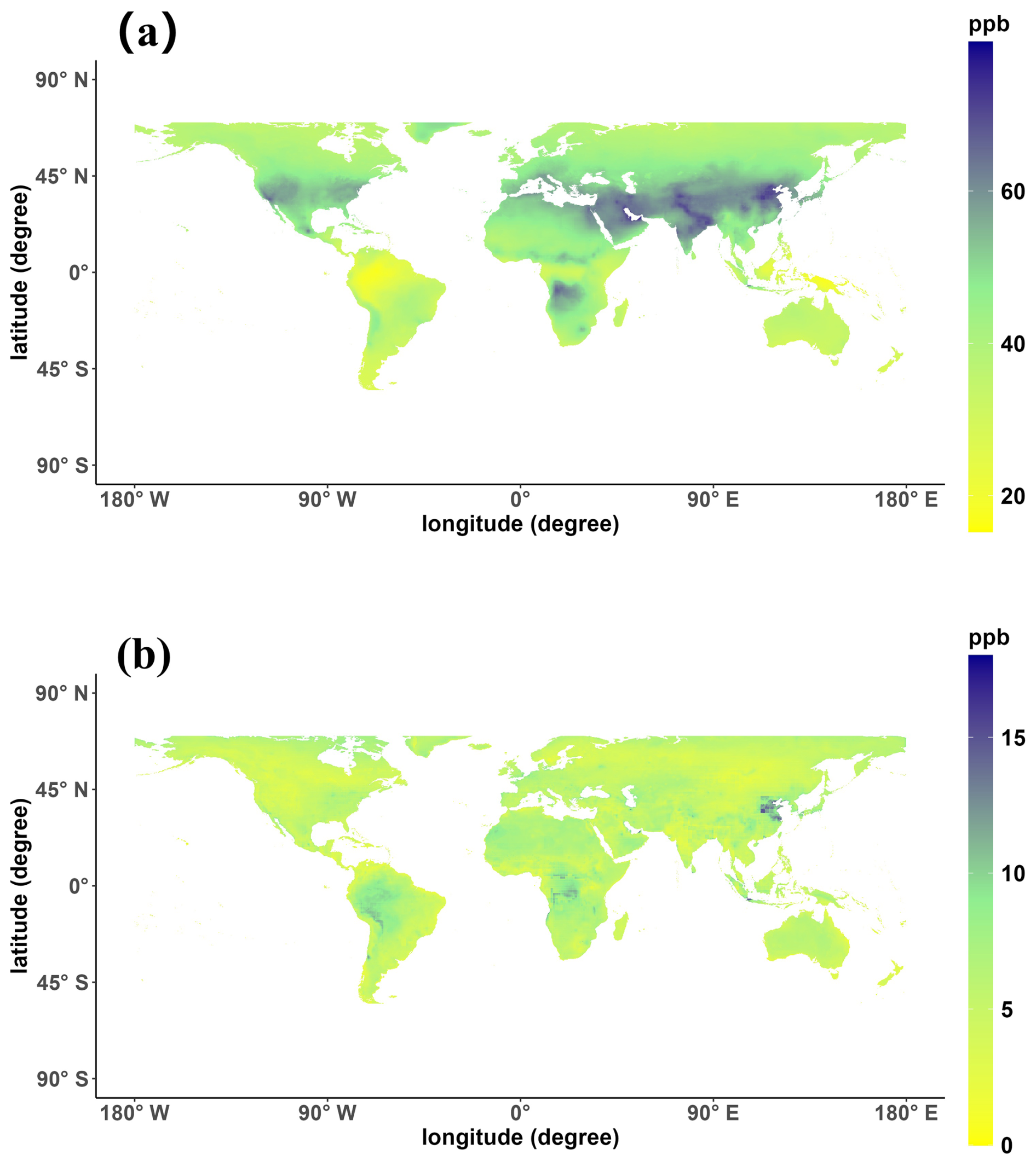 We utilized two machine learning global ground-level ozone datasets from the University of Cambridge, and Nanjing University. The University of Cambridge's machine learning (UKML) dataset was developed using a space-time Bayesian neural network, fusing various data sources including historical observations, CMIP6 multi-model simulations (AerChemMIP historical simulations and ScenarioMIP projections), population distributions, land cover properties, and emission inventories (Sun et al., 2022) (input data summarized in Table S2). The UKML model categorized TOAR-I monthly ozone observations from 1990 to 2014 into urban and rural areas, and used these as labels for supervised learning. This model generates monthly global gridded ozone estimates from 1990 to 2019, downscaled to a 0.125° × 0.125° spatial resolution. It exhibited great performance in predicting urban and rural surface ozone concentrations, with R2 values ranging from 0.89 to 0.97 and RMSE values between 1.97 and 3.42 ppb (Sun et al., 2022).